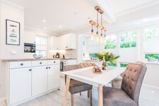 Cerankochfeld, Dunstabzugshaube, Kühlschrank mit Gefrierfach, Eierkocher, Mixer, Korkenzieher / Flaschenöffner, Essplatz in der Küche