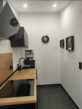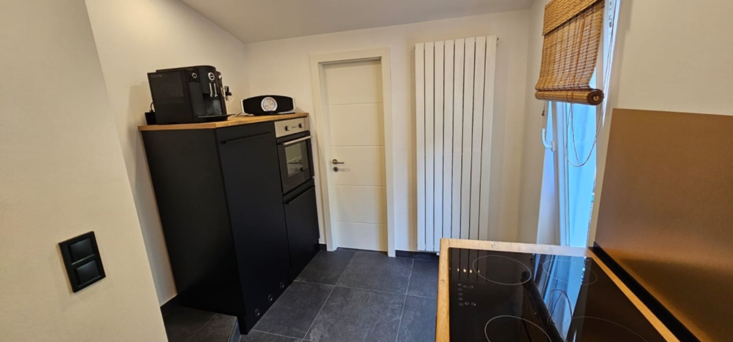4-Platten Herd, Cerankochfeld, Kühlschrank mit Gefrierfach, Kaffeevollautomat, Geschirrhandtücher, Mülltüten