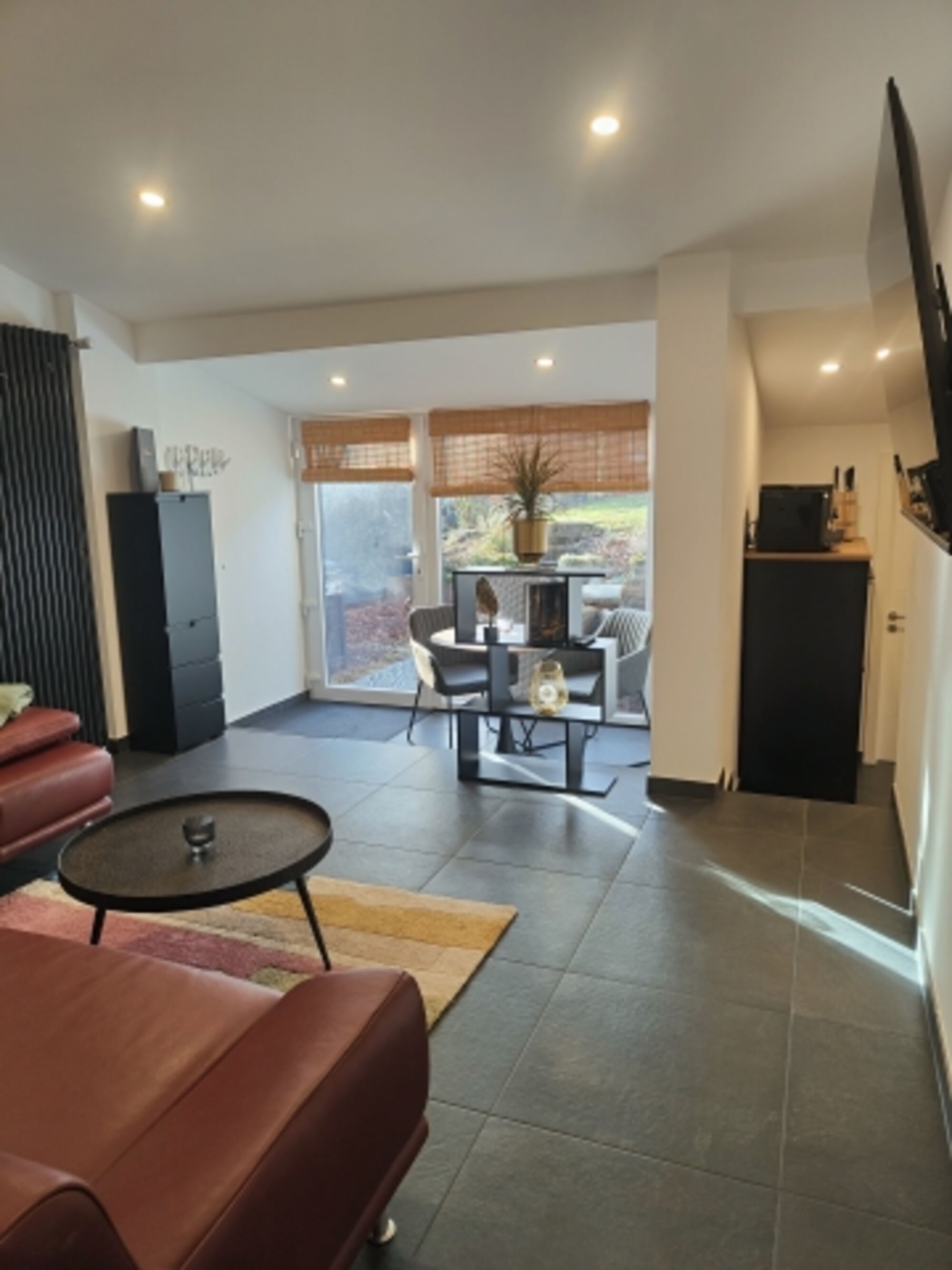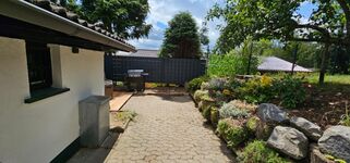 Unser Essensbereich befindet sich direkt an einer großen Fensterfront, von der Sie einen schönen Blick in den Garten genießen. Das Wohnzimmer ist mit einer großen Eckledercouch und einem Smart-TV eingerichtet. Eine programmierbare Stehlampe sorgt für eine gemütliche Atmosphäre. Auch Ihr Hund kann es sich in dem vorhandenen Hundebett bequem machen. Sie sollen sich bei uns wie zu Hause fühlen! Die Küche beinhaltet einen Elektroherd mit großem Cerankochfeld, Geschirrspülmaschine, Kühlschrank mit einem Gefrierfach, Kaffeevollautomat, Kaffeemaschine für Filterkaffee, Toaster, Wasserkocher, Geschirr, Besteck, Kochtöpfe/ Pfannen und viele weitere Küchenutensilien, die man für den täglichen Gebrauch in der Küche benötigt. In dem Abstellraum finden Sie unsere Waschmaschine, einen Feuerlöcher und Reinigungsutensilien. Der gemütliche Schlafraum verfügt über ein 180x200 cm großes und bequemes Boxspringbett mit einer durchgängigen Matratze und einem Kleiderschrank mit einem Ganzkörperspiegel. Das feine Badezimmer ist mit einem modernen WC, einer ebenerdigen Dusche, einem freistehenden Waschbecken inklusive Unterschrank und einem Haartrockner eingerichtet.
