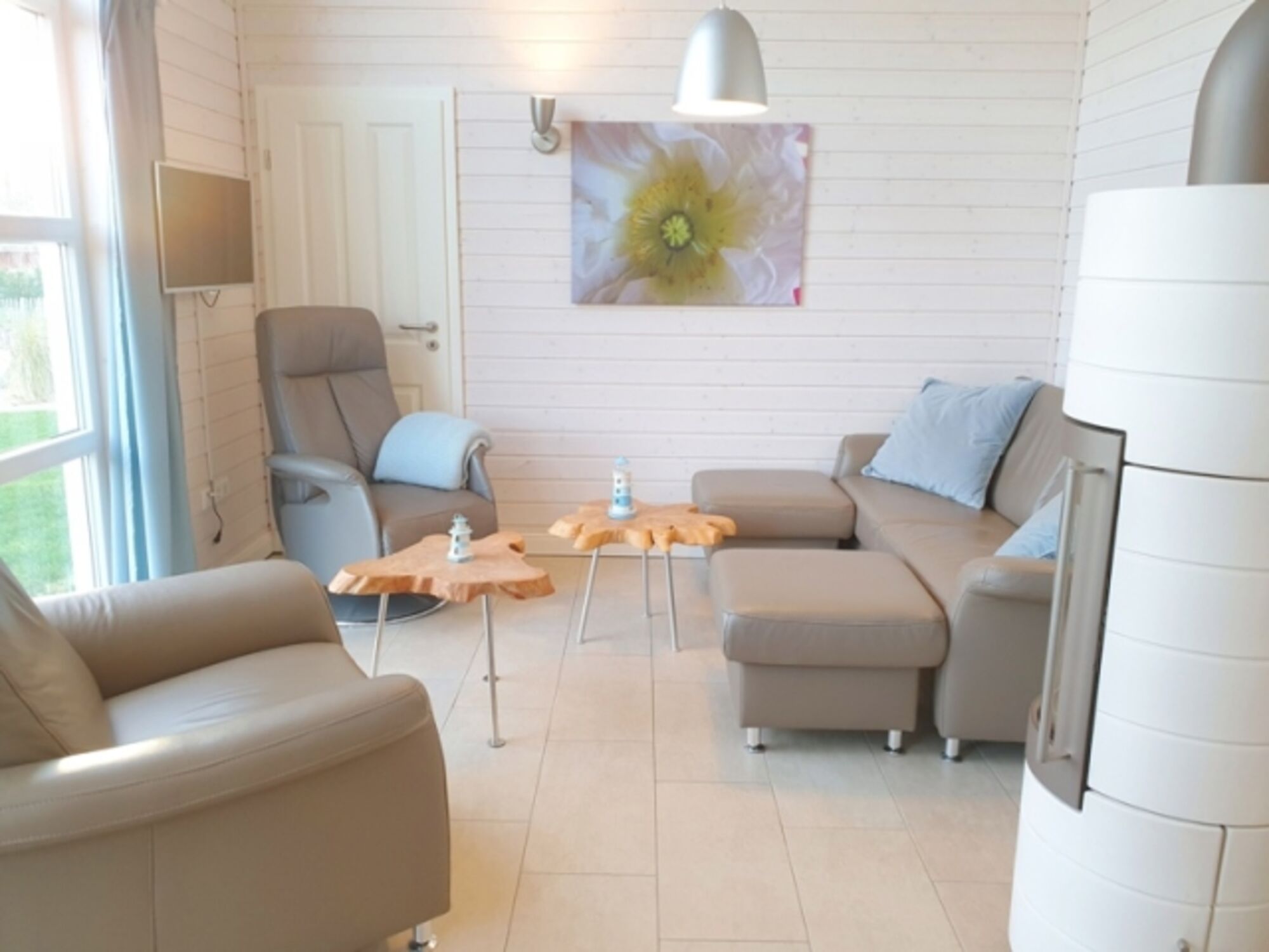 Wohnzimmer: Couch, Kaminofen, viel Licht