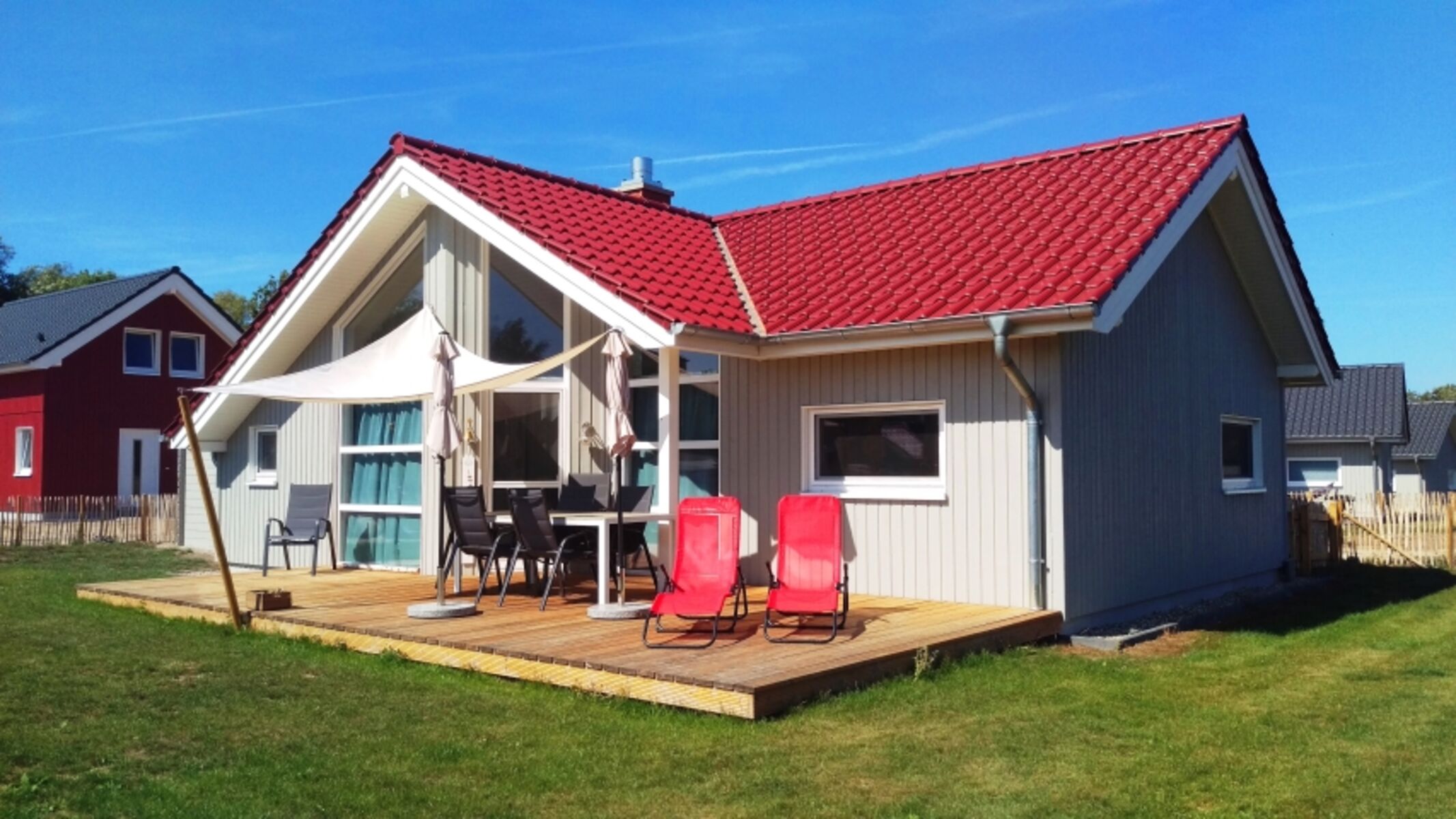 Außenausstattung: Terrasse, Gartenmöbel, Strandkorb am Haus, Liegen, Sonnenschirm, Grill, Strandspielzeug, 2 PKW-Stellplätze, Bollerwagen, Gartenhaus