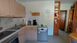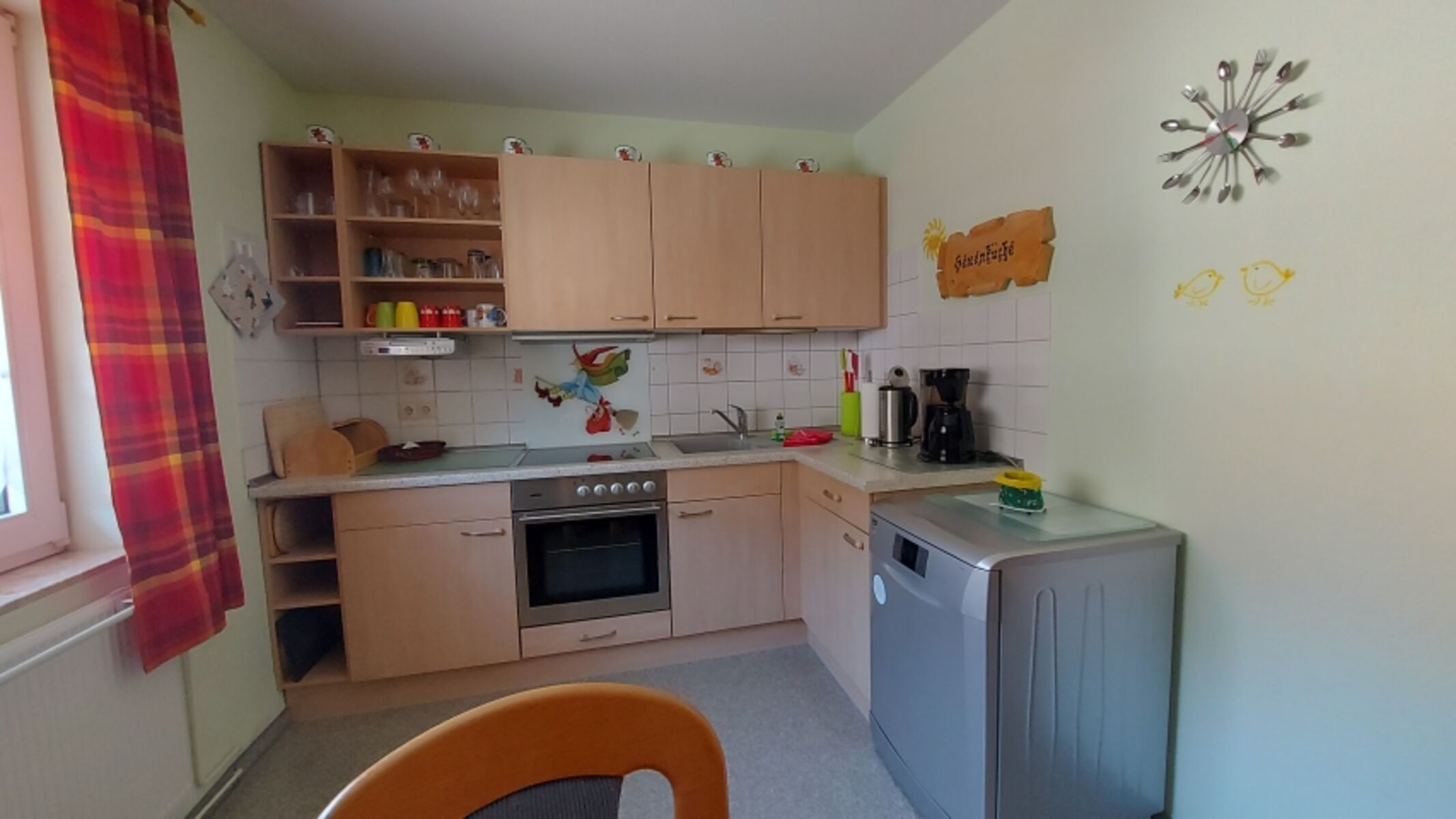 4-Platten Herd, Cerankochfeld, Dunstabzugshaube, Kühlschrank mit Gefrierfach, Eierkocher, Mixer, Korkenzieher / Flaschenöffner, Gewürze (Salz, Pfeffer, Zucker), Öl / Essig, Geschirrhandtücher, Mülltüten, Essplatz in der Küche