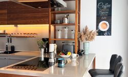 Induktionsherd, Kühlschrank mit Gefrierfach, Eierkocher, Mixer, Korkenzieher / Flaschenöffner, Essplatz in der Küche