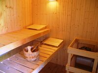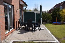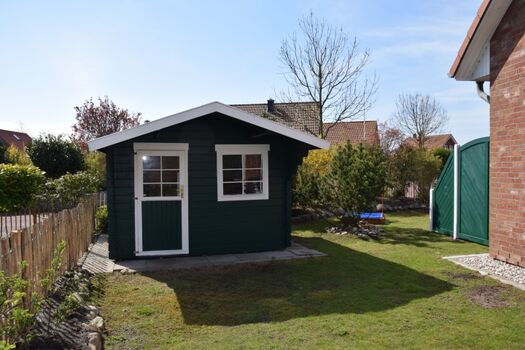 Außenausstattung: windgeschützte Süd-Terrasse, eingezäuntes Grundstück, Gartenmöbel, Sonnenschirm, Liegen, Grill, Strandspielzeug, Bollerwagen, PKW-Stellplatz, Saunahaus