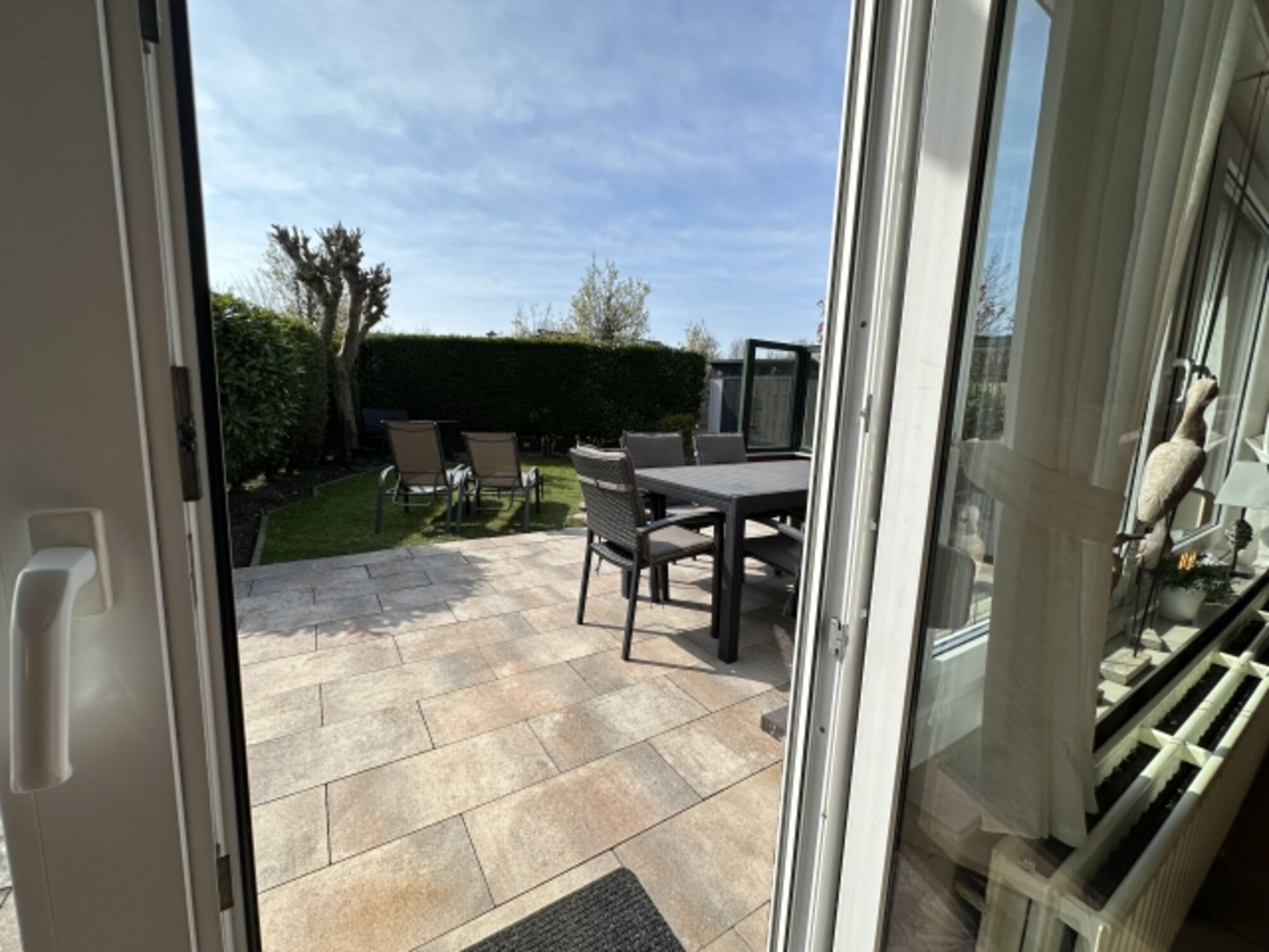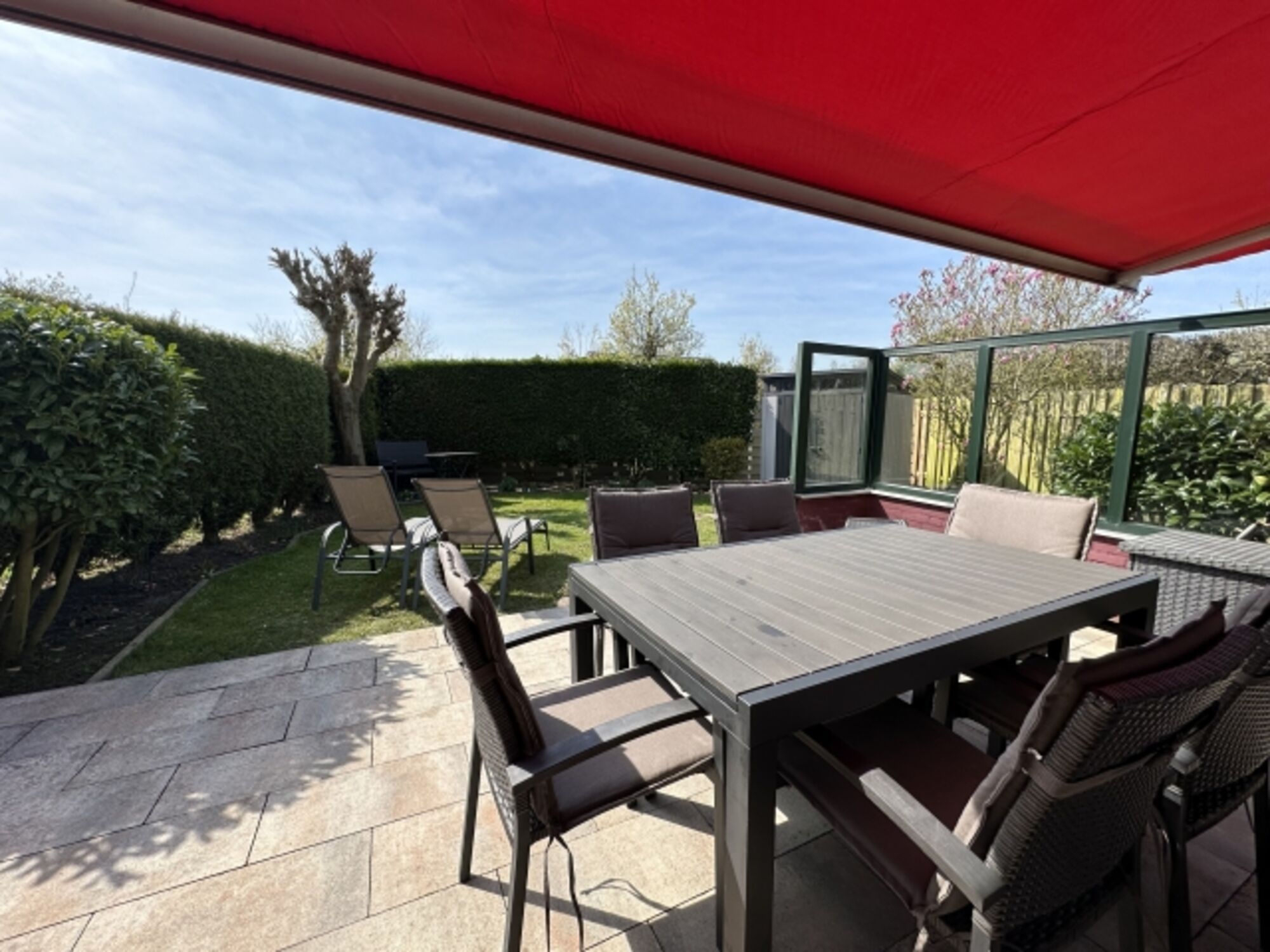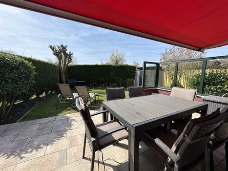 Im abgeschlossenen Garten mit Terrasse, Gartenmöbeln und Markise können Sie einen entspannten Urlaubstag verbringen.