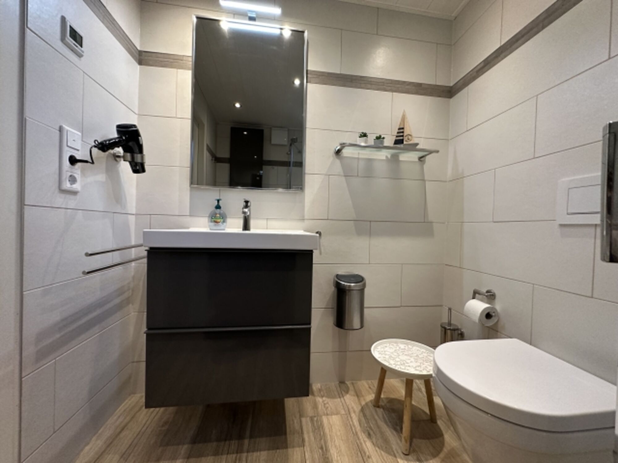 Das Badezimmer wurde im Frühjahr 2018 komplett saniert und verfügt über eine bodentiefe Dusche, ein WC sowie ein Waschbecken. Abstellmöglichkeiten für Kosmetikprodukte sind ebenfalls ausreichend vorhanden