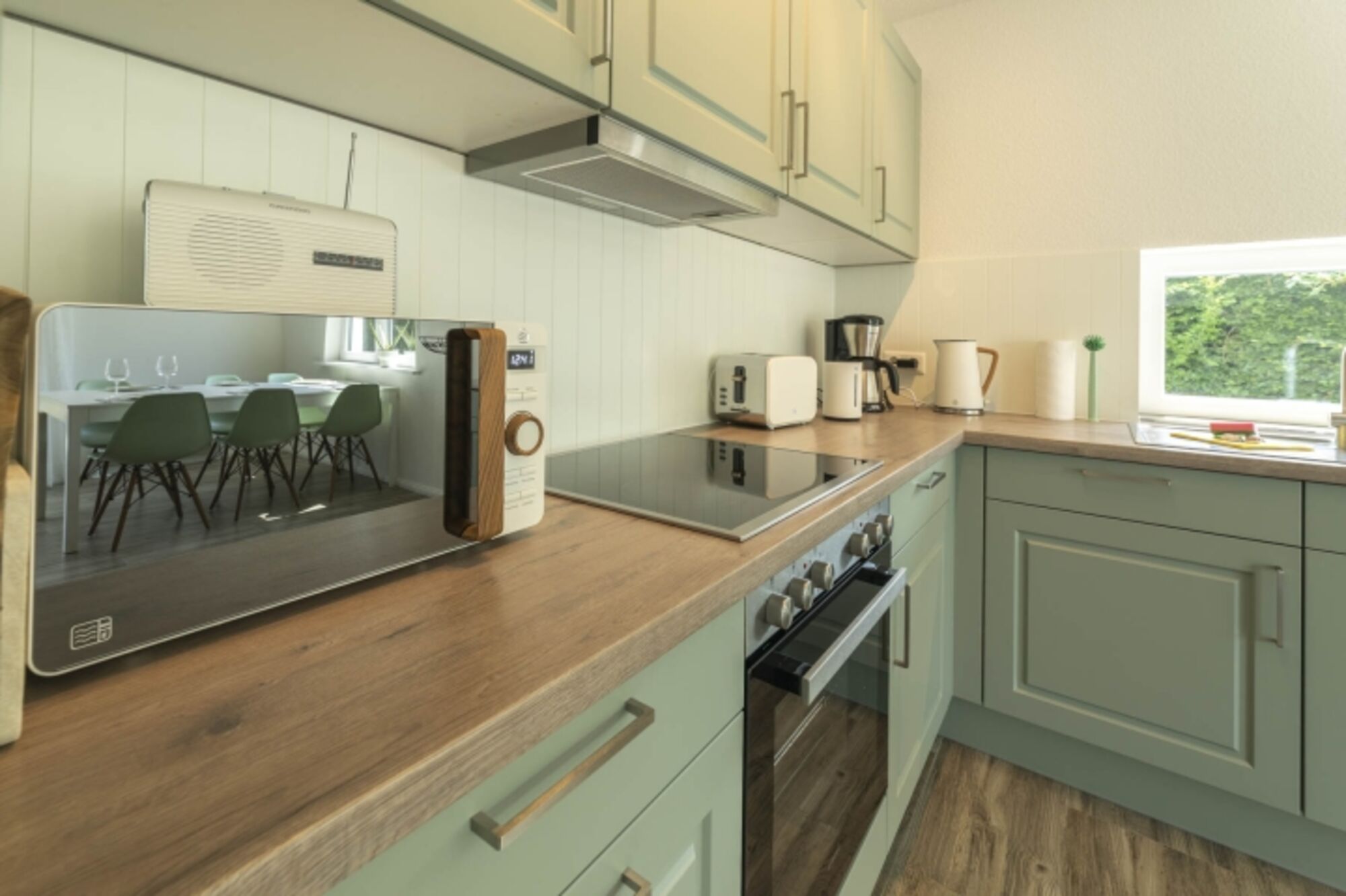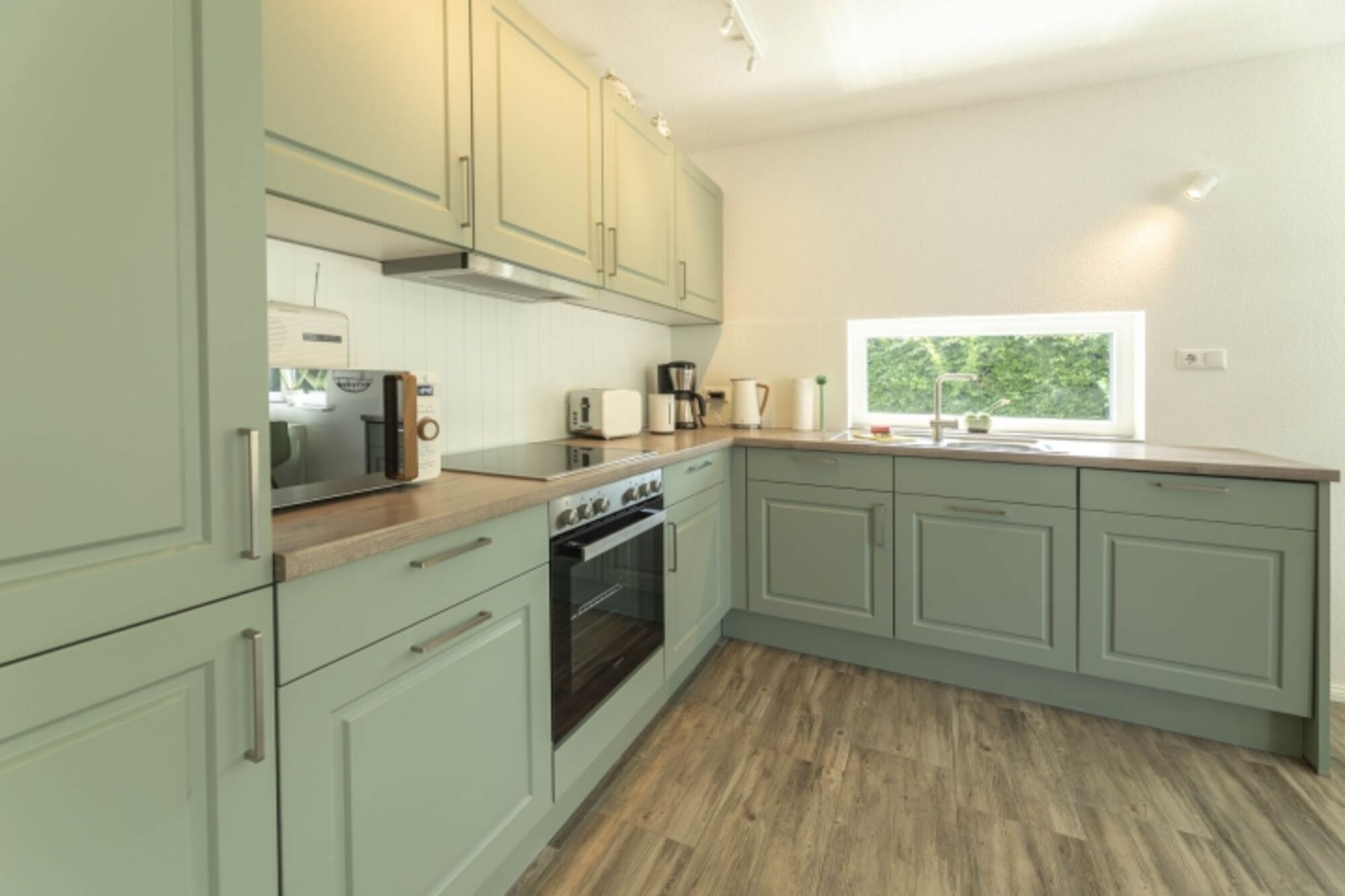 Cerankochfeld, Dunstabzugshaube, Kühlschrank mit Gefrierfach, Korkenzieher / Flaschenöffner