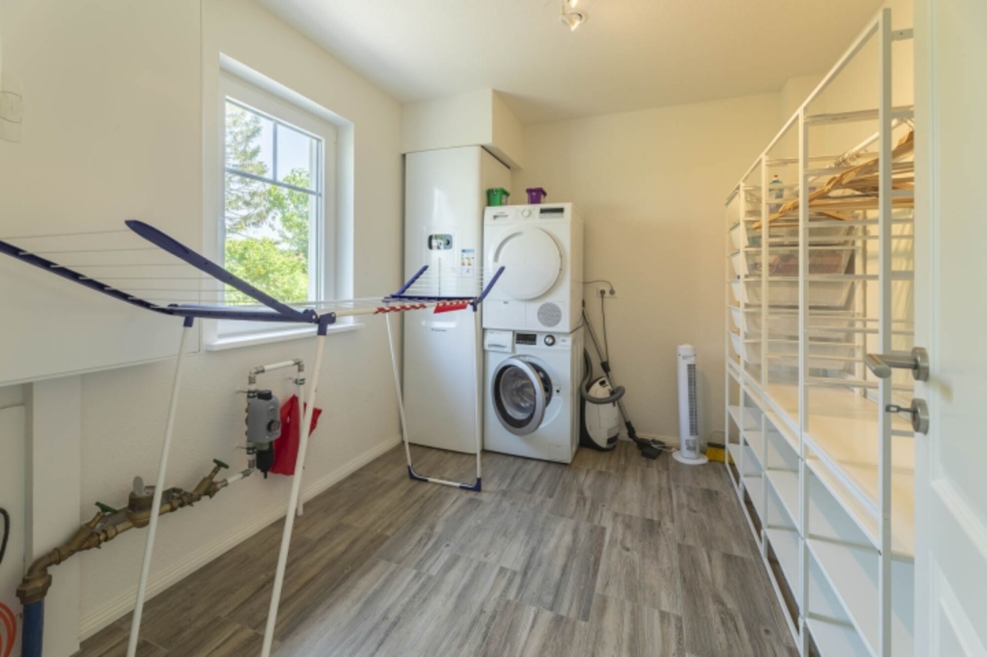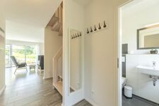 Im Obergeschoss des charmant eingerichteten Hauses punktet auch das Badezimmer. Mit einer sehr bodennahen Dusche (nicht ebenerdig), einem großzügigen Waschbecken, einem WC und einer eleganten Gestaltung wirkt es sehr freundlich. Gegenüber liegt die Sauna, die dem Wohlfühlfaktor der Unterkunft noch weitere Argumente verleiht. Im Erdgeschoss befindet sich eine kleine liebevolle Gästetoilette.Natürlich ist ein Hauswirtschaftsraum mit großzügiger Garderobe, Waschmaschine und Trockner vorhanden.