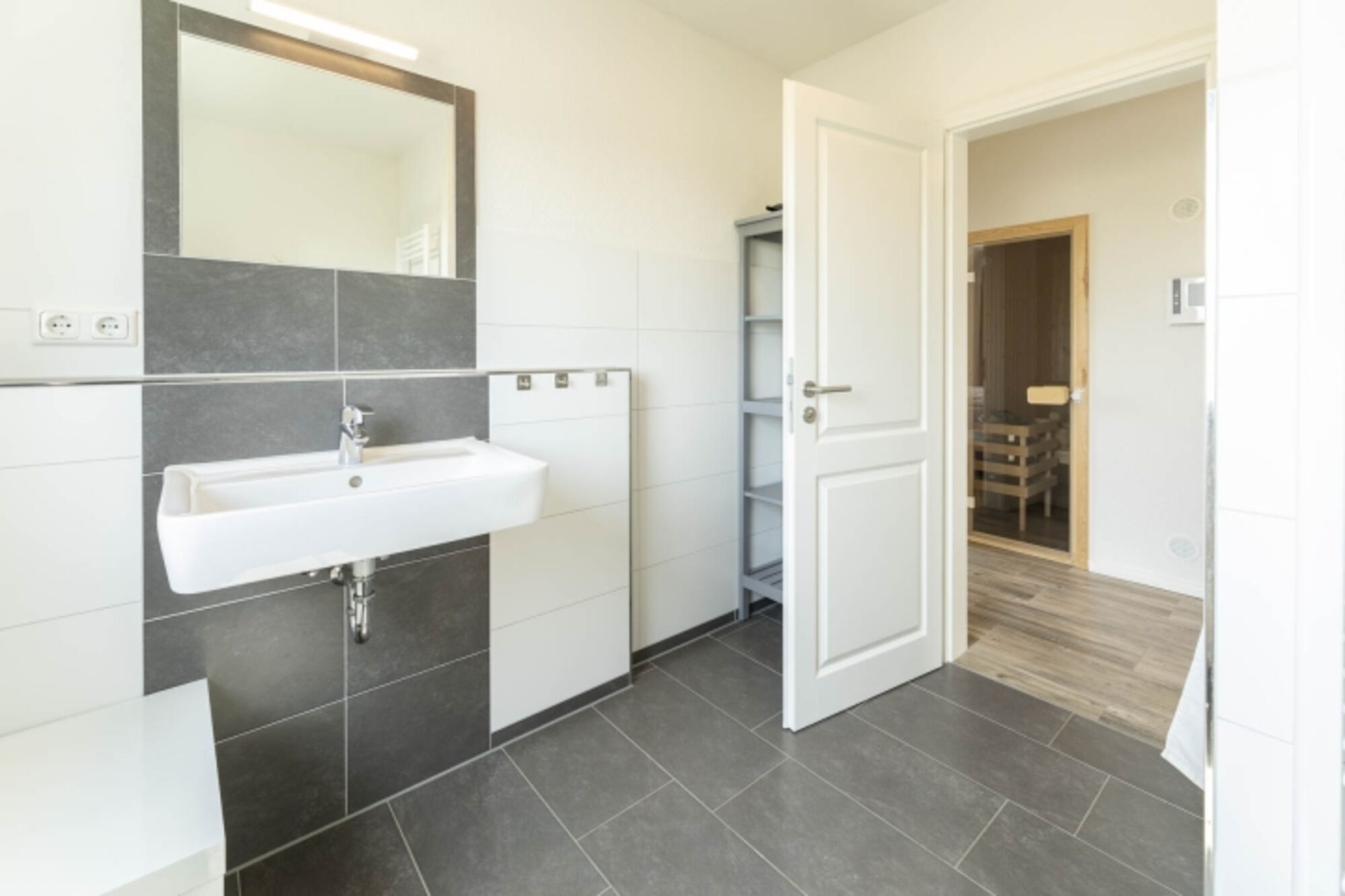 Eine Sauna befindet sich im 1 Obergeschoss des Hauses. Waschbecken, Spiegel, Fenster im Bad