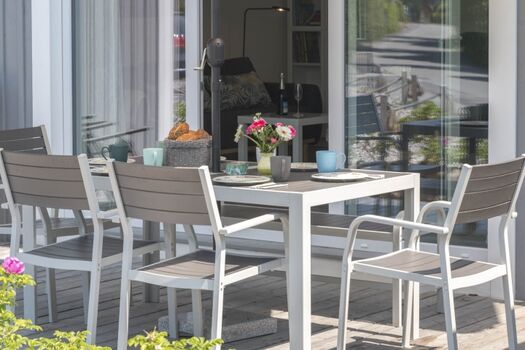 Der stilvolle Außenbereich, der direkt von dem Wohn- und Essbereich zugänglich ist bietet mit einer Terrasse mit Gartenmöbeln einen weiteren Ort der Erholung.