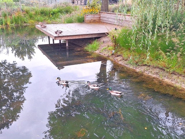 Im Außenbereich des Hauses findet man angrenzend am Wohn/Esszimmer/Küchenbereich eine große geräumige Terrasse mit Tisch und Stühlen sowie einem großen Sonnenschirm. Im Anschluss direkt daran findet man zusätzlich noch eine große Wasserterasse wo man viele verschiedene Enten ,Kraniche,Fröschen auf dem Teich bei Ihren Ausflügen zusehen kann.