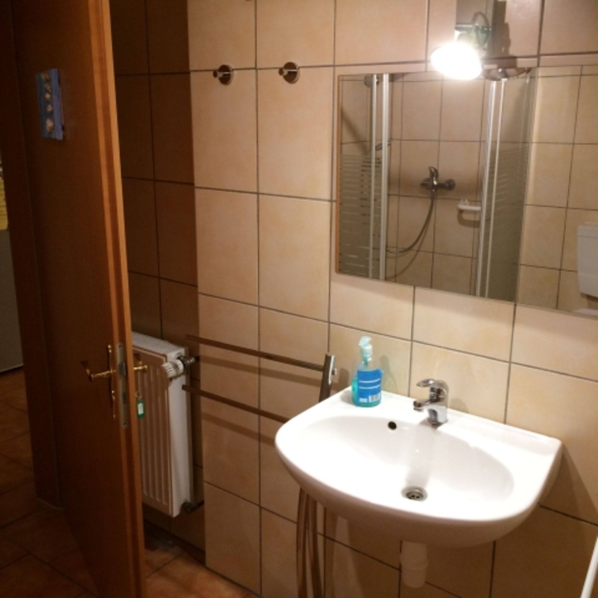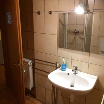 Waschbecken, Spiegel, Fenster im Bad, Fliegengitter