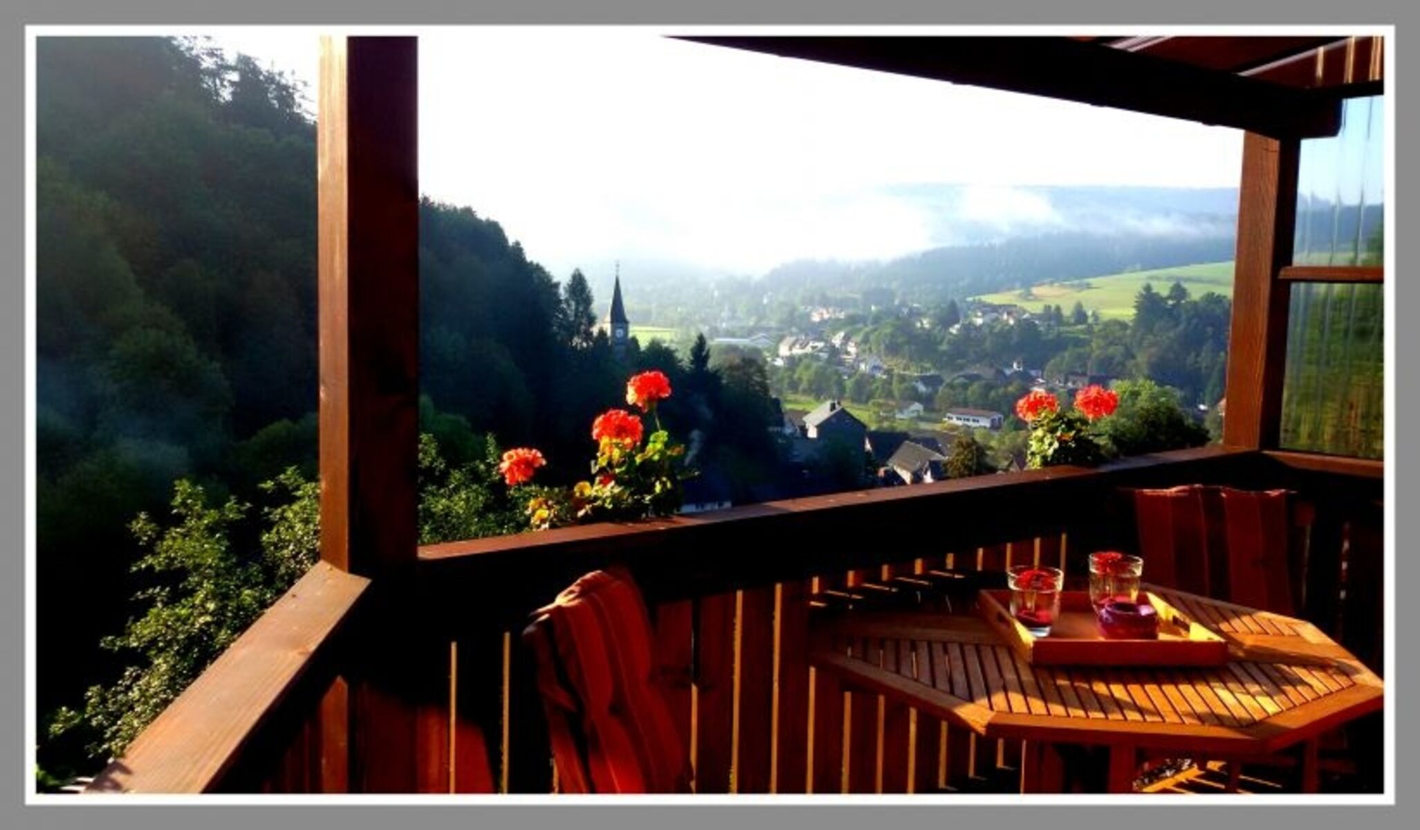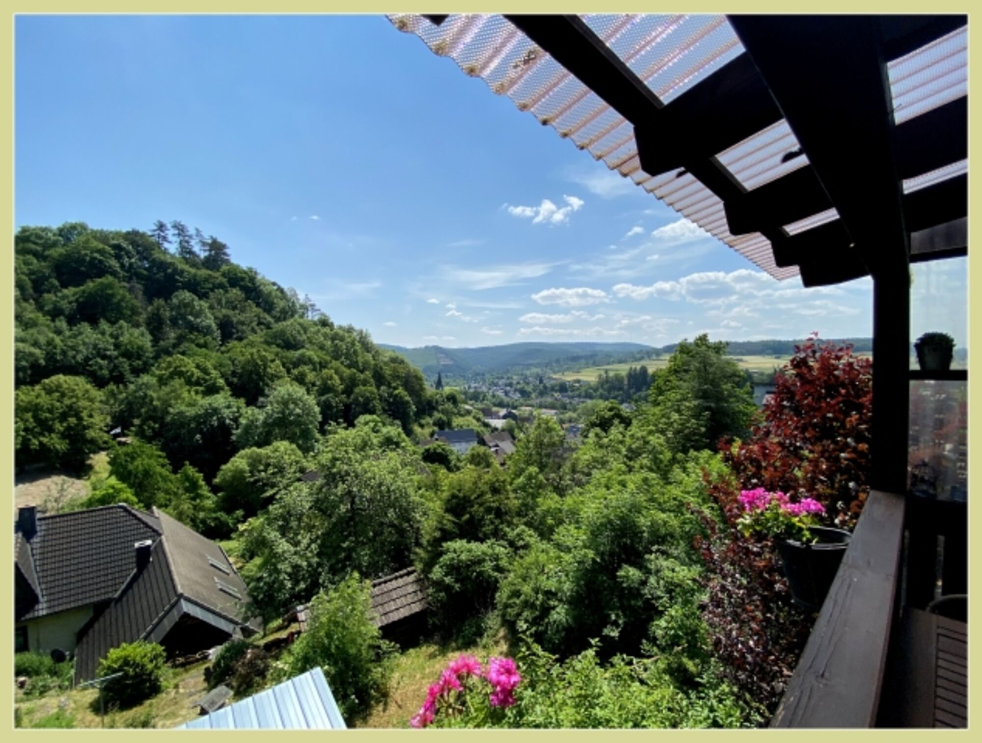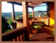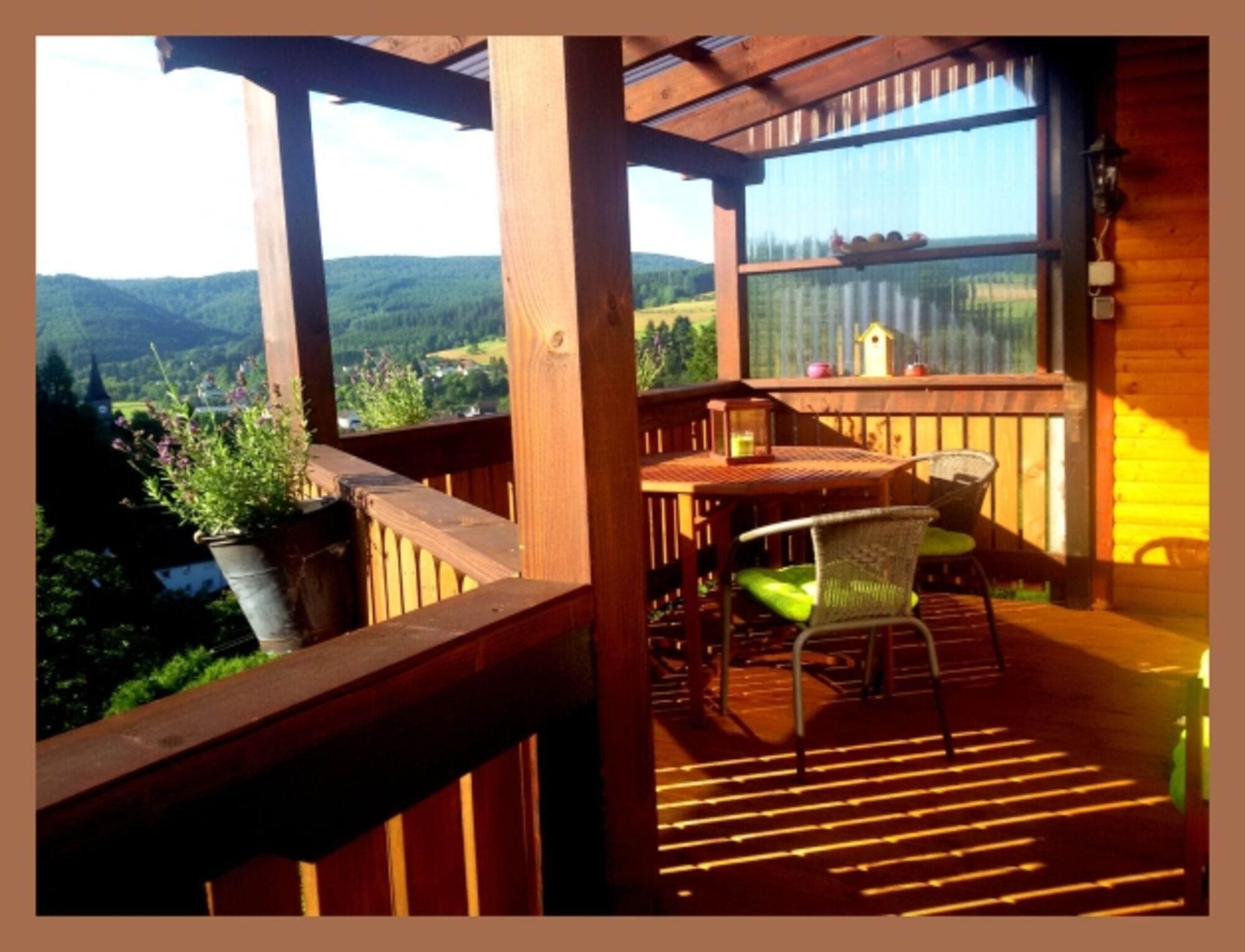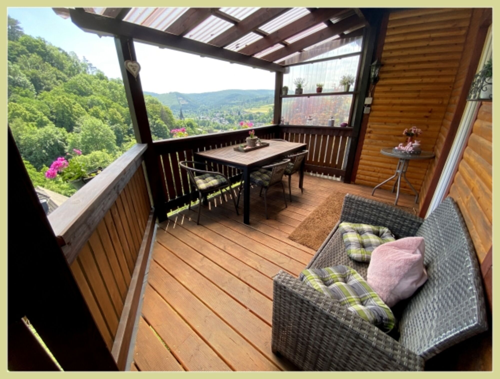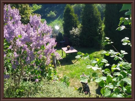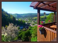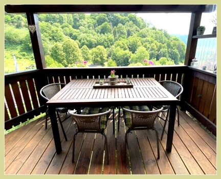 Auf unserem überdachten Balkon können Sie den wunderschönen Panoramablick auf Hatzfeld und den Wald genießen und auch bei Regenwetter draußen sitzen.Von dort können Sie direkt in den zum Haus gehörenden eigenen Gartenbereich gehen wo Sie ein Sonnenbad nehmen oder gemütlich beieinander sitzen und grillen können .