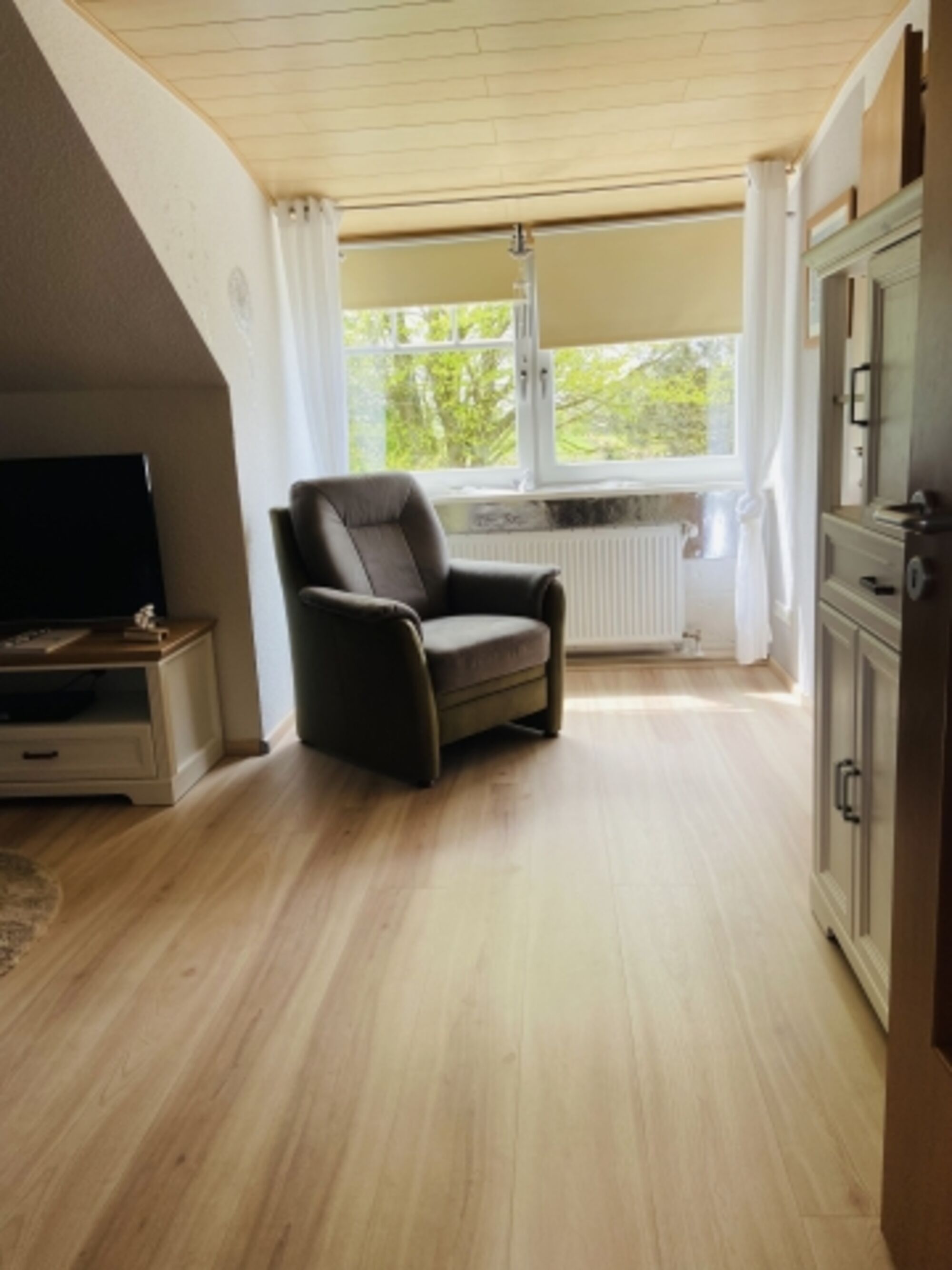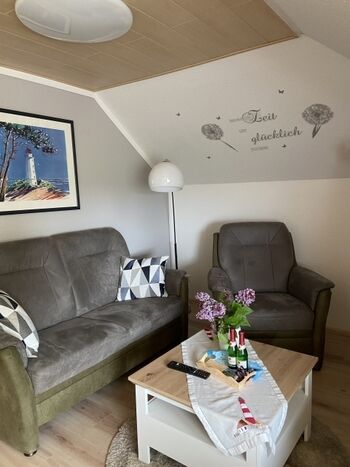 Genießen Sie eine kleine, aber liebevoll gestaltete Wohnung. (45 qm) Die Treppe zu Ihrem Rückzugsort ist geschlossen und mit textilen Belägen versehen, um auch Ihrem vierbeinigen Begleiter ein komfortables Hochkommen zu ermöglichen. Im Wohnzimmer erwartet Sie eine einladende Sofagarnitur zum Relaxen und Faulenzen. Für unterhaltsame Stunden bei schlechtem Wetter steht ein moderner Smart-TV mit Netflix für Sie bereit.