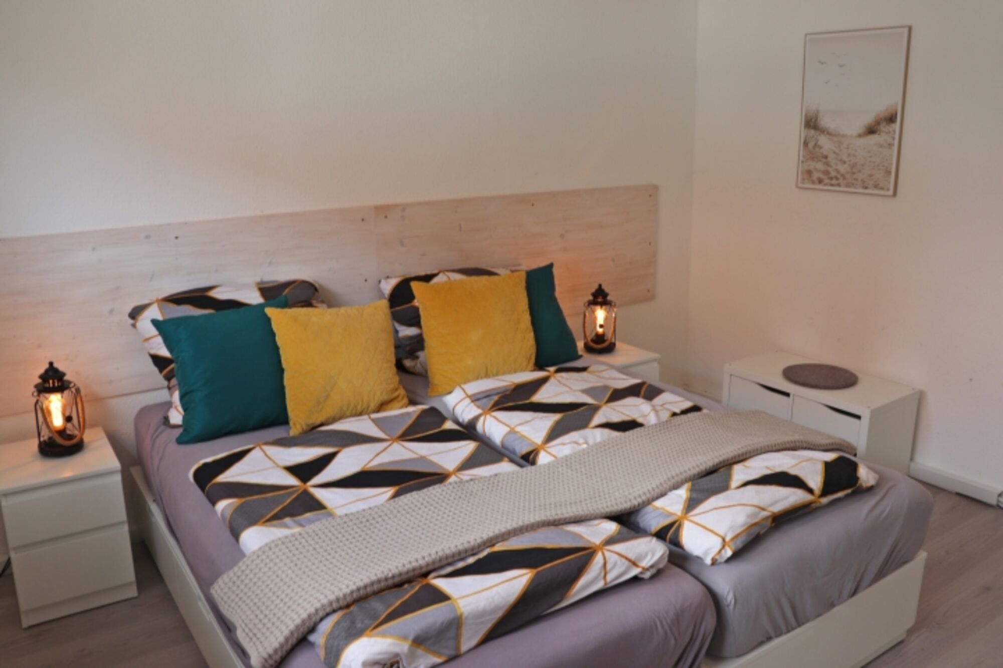 Betten sind wahlweise als Doppelbett 180x200 (fest verbunden) oder zwei 90 x 200 Betten stellbar. Doppelbett 1,80 x 2,00m, Einzelbett, Kommode, Spiegel, Leselampe am Bett, Fliegengitter