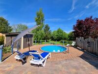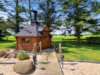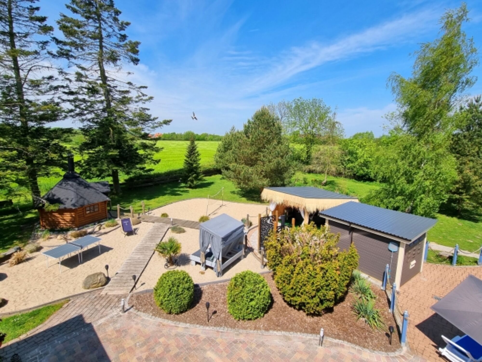 Der große Garten ist mit über 1000qm ein grünes Paradies. Für Erfrischung sorgt der Rundpool, für Wärme und Entspannung die Sauna mit zugehöriger Außendusche. Daneben steht den Gästen ein elektrischer Whirlpool zur Verfügung. Sollte es einmal regnerisch sein, oder wenn ihr es einfach nur gemütlich mögt, steht eine Grillkota als Mittelpunkt zwischen eigens angelegten Sandgärten bereit. Für Aktive Gäste gibt es einen Sandplatz mit Netz zum Volleyball und Badminton spielen, eine Tischtennisplatte und zusätzlich eine Outdoor-Dartscheibe. Über das gesamte Areal sind mehrere Sitzecken mit und ohne Sonnenschirme verteilt. Auch abends sorgt die Ausrichtung nach Westen für die schönsten Sonnenuntergänge über die Weiten der Felder. Dazu lässt sich stimmungsvolle Beleuchtung einschalten.