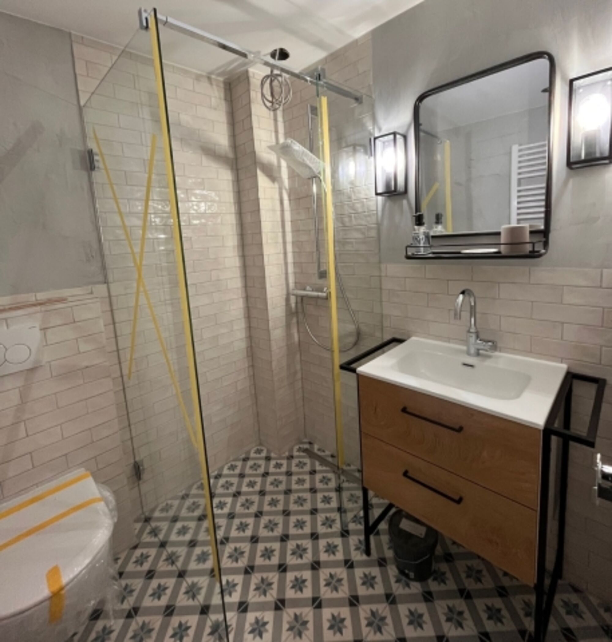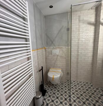 Das Badezimmer ist mit orientalisch angehauchter Fliesen gestaltet und bietet Ihnen mit der bodentiefen geräumigen Dusche Ihren eigenen Wellnessbereich. Sowohl Waschmaschine als auch Trockner sind im gemeinschaftlichen Keller untergebracht, der auch ausreichend Platz bietet, Ihre Wäsche klassisch auf der Leine trocknen zu lassen.