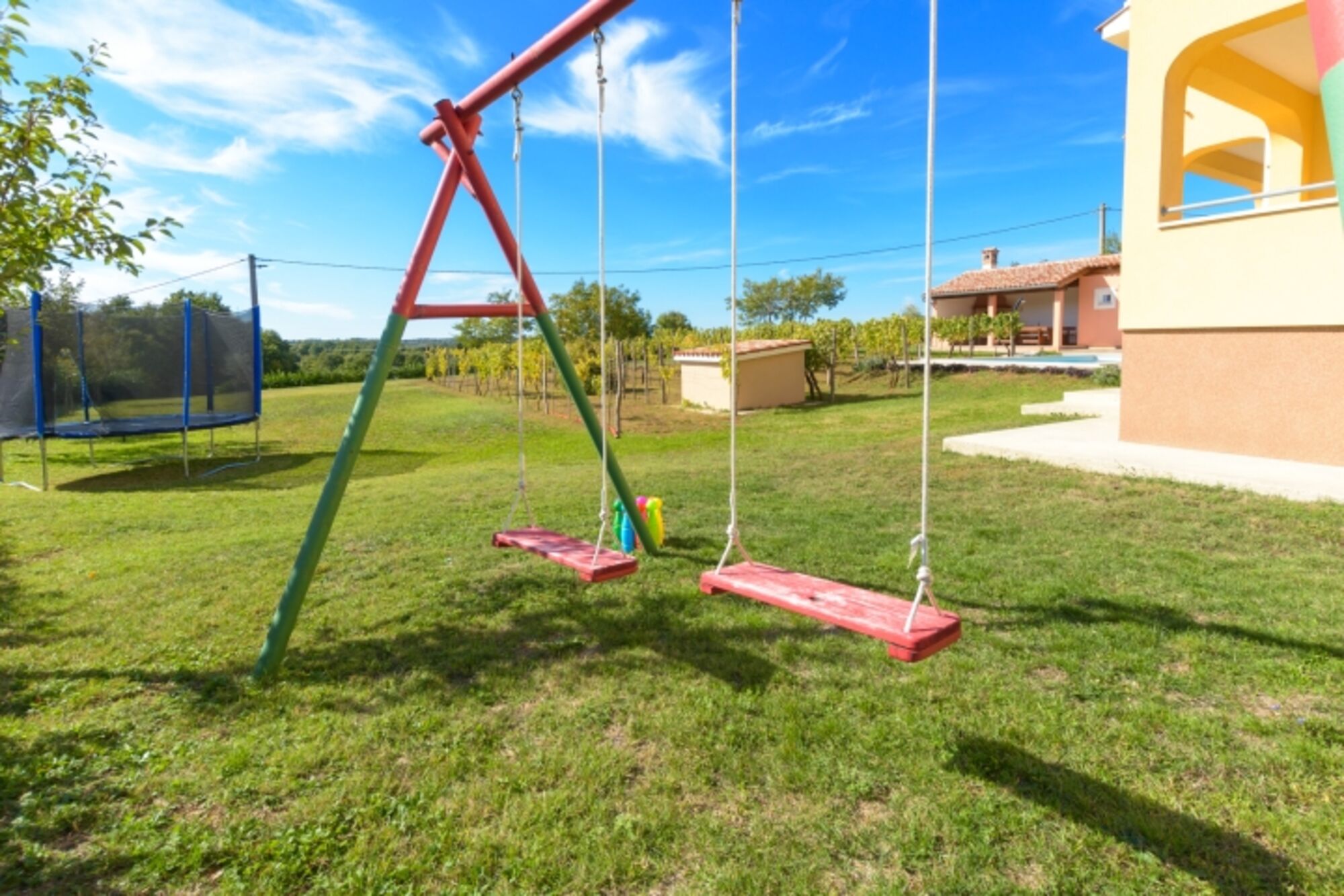Für Unterhaltung und Freizeit sorgt ein Spielzimmer mit Billard, Darts, Tischfußball und PlayStation-Konsole, ideal für Familien und Freunde. Besonders beeindruckend ist der weitläufige Garten mit Weinberg, großer Wiese mit Schaukel, Trampolin und Spielplatz für Volleyball, Fußball oder Badminton. Der Pool mit Hydromassage-Düsen bietet Erfrischung an heißen Sommertagen und sorgt für völlige Entspannung.