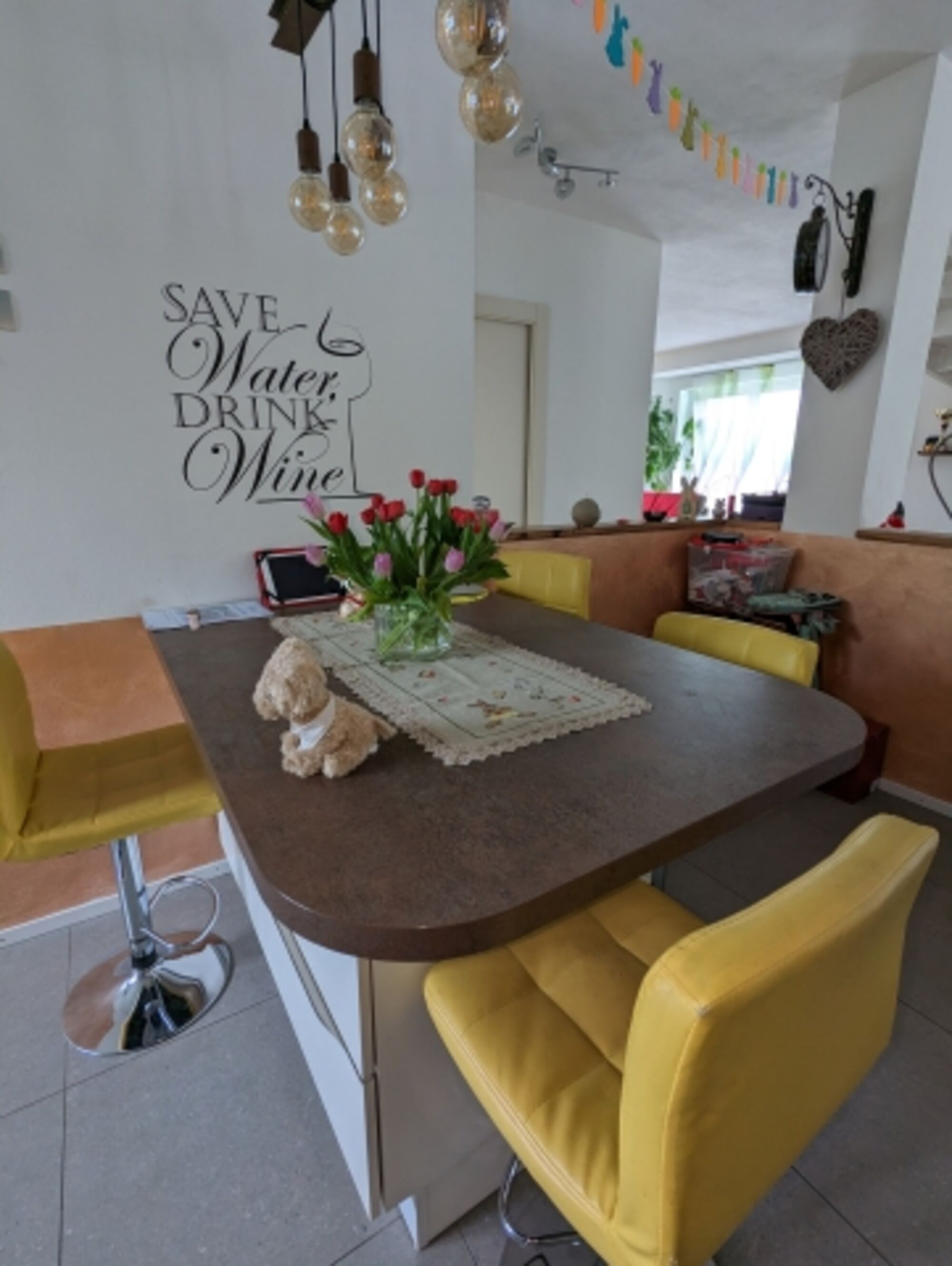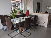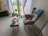 Einrichtung: Wohnfläche ca. 180 qm. Sehr gemütlich eingerichtet. Das Haus wird ausserhalb der Vermietung auch privat bewohnt. Eingangsbereich mit Garderobe – offen zur Wohn-Essküche. Essecke mit Kaminofen, SAT-TV. Essplatz. Sehr gut ausgestattete moderne Küche mit Gasherd mit 5 Flammen, Spülmaschine, Kühlschrank, Gefrierschrank (praktisch für Barfer) Kaffeemaschine, Espressomaschine, Mikrowelle, Backofen, Wasserkocher. Sitzplatz für 4 Personen. Schlafzimmer mit Doppelbett und Ausgang in den Garten. Eigenes schickes Badezimmer im EG mit Dusche/ WC/ Bidet.