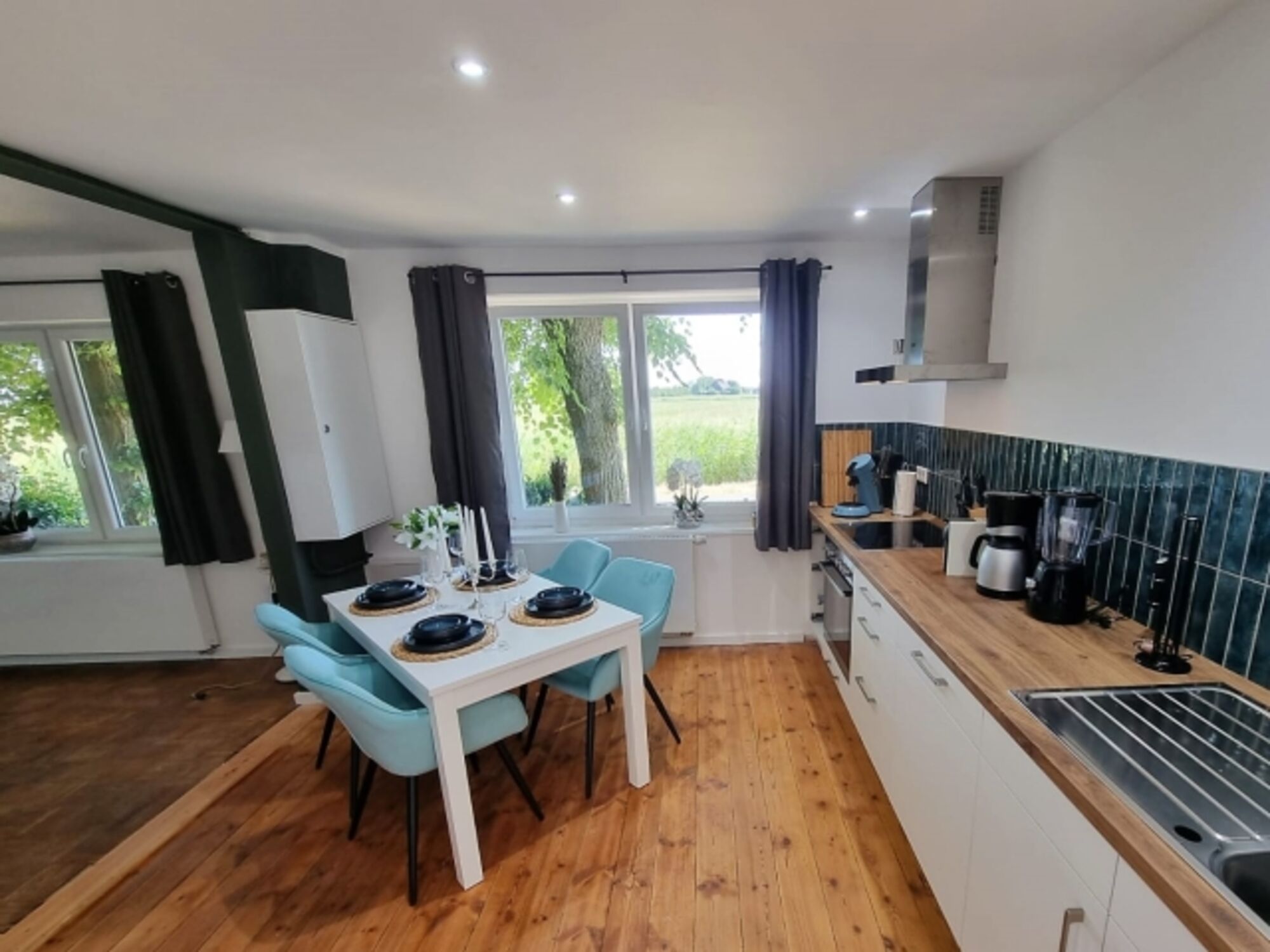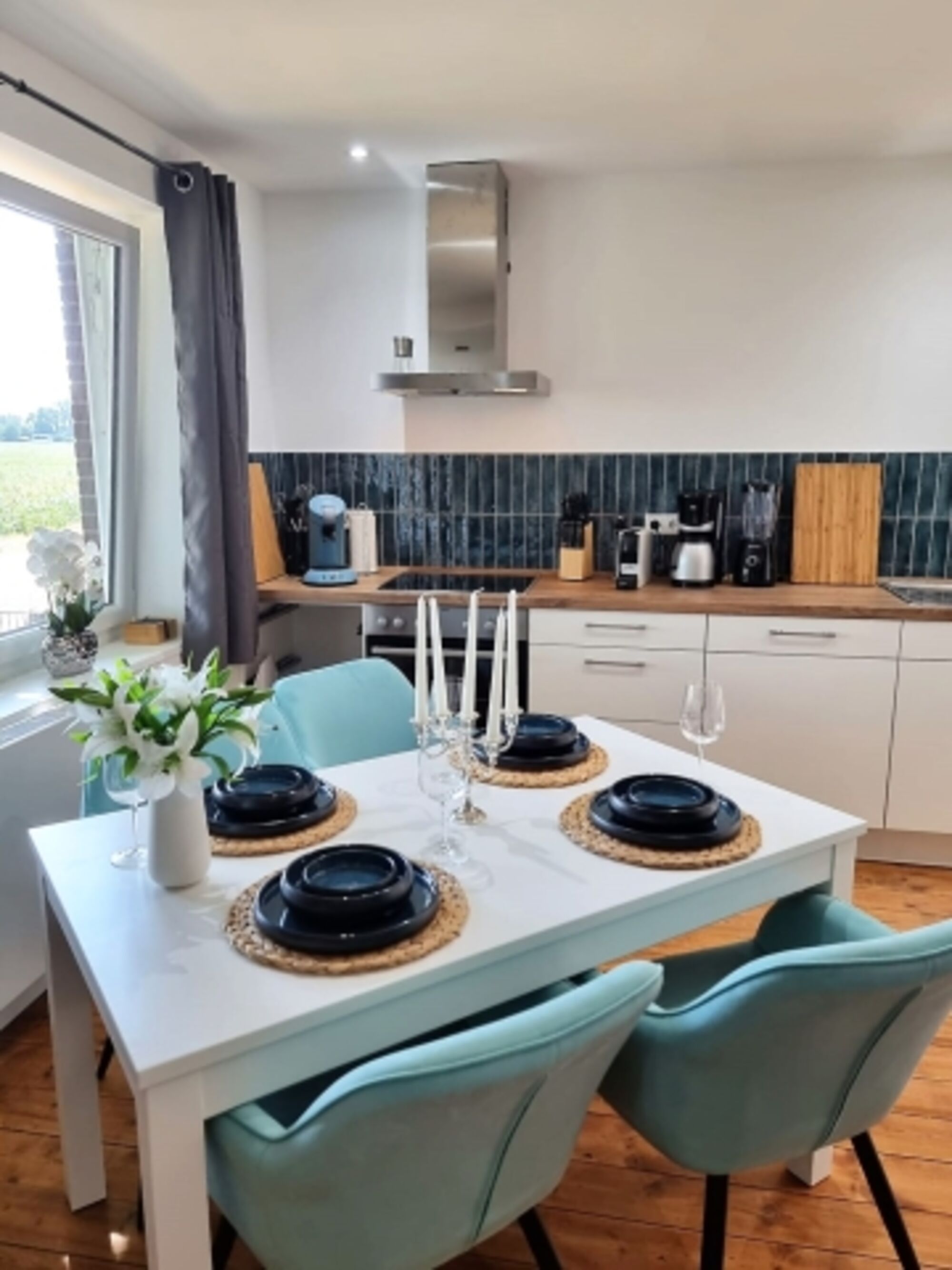 4-Platten Herd, Induktionsherd, Dunstabzugshaube, Kühlschrank mit Gefrierfach, Nespresso-Automat, Eierkocher, Küchenmaschine, Mixer, Eismaschine, Korkenzieher / Flaschenöffner, Essplatz in der Küche