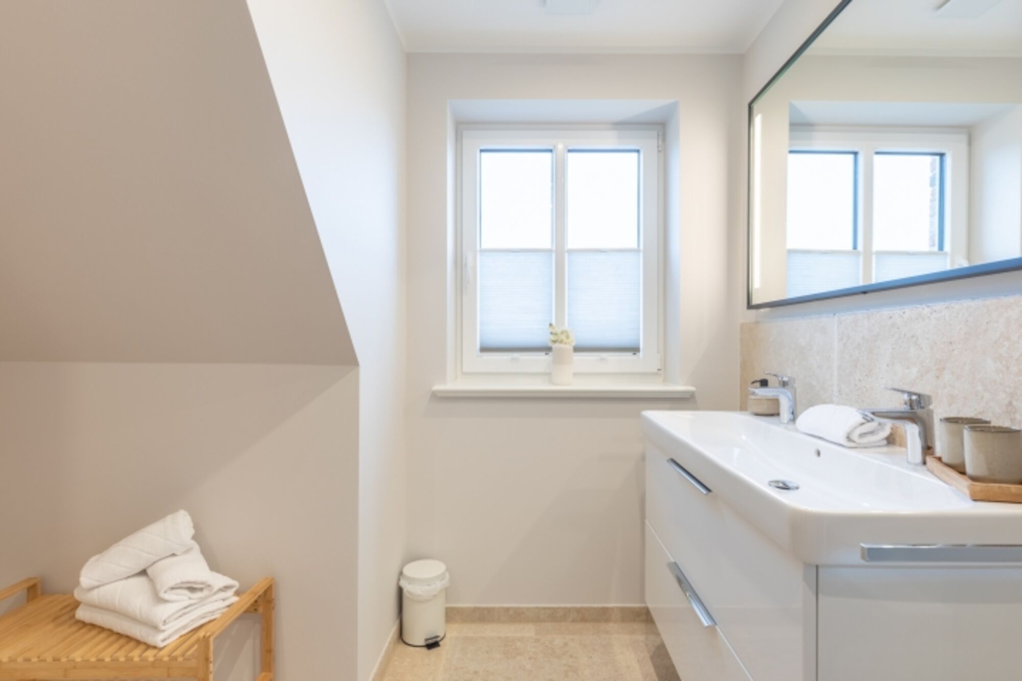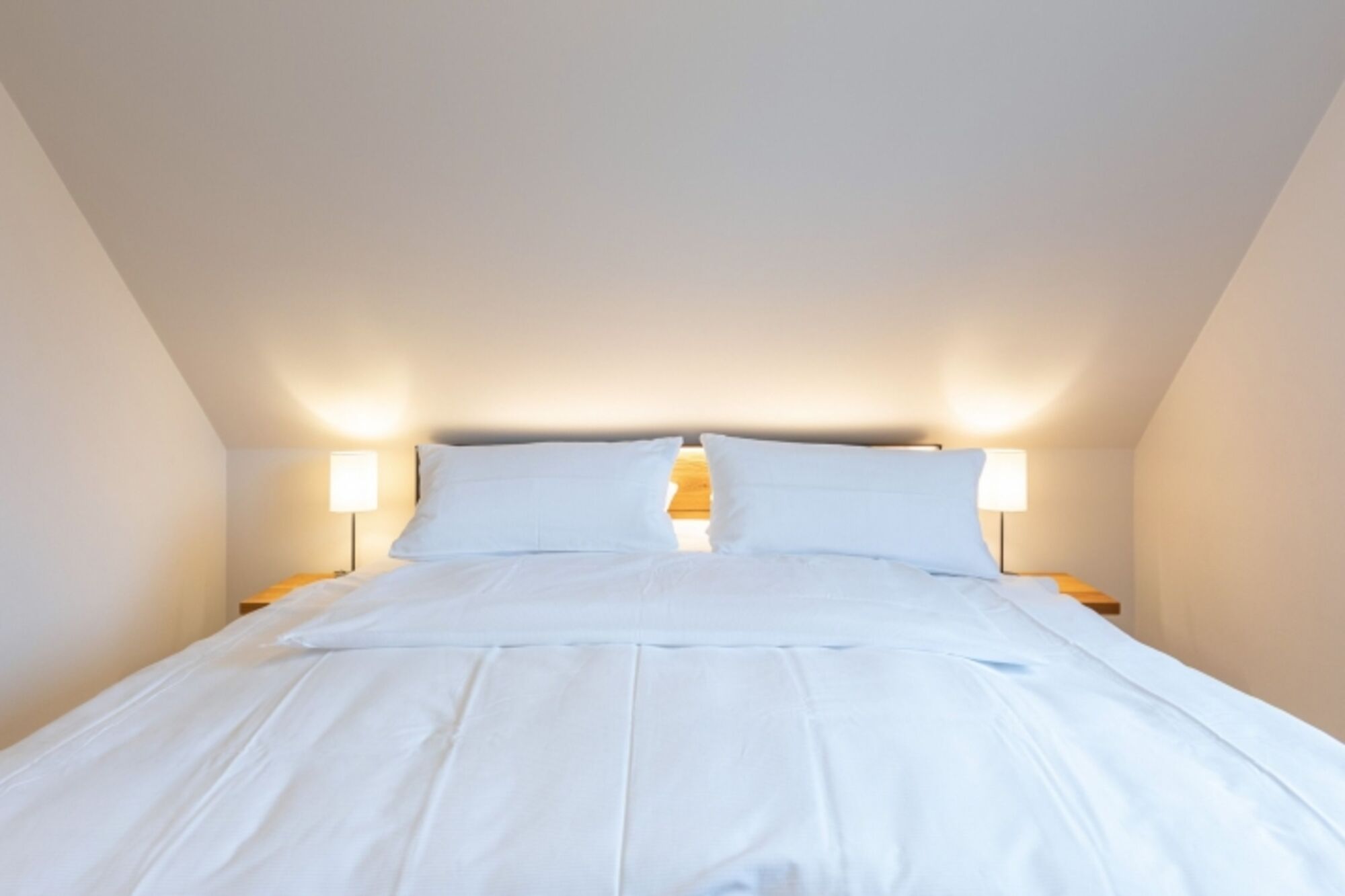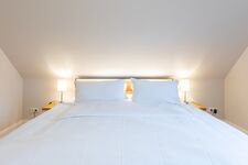 Über eine geschlossene Holztreppe erreichen Sie das Obergeschoss mit zwei Schlafzimmern. Die Betten (je 180 × 200) sind bei Ankunft liebevoll bezogen. Das Duschbad und das Badezimmer mit Wanne und Sauna gibt Ihnen den nötigen Freiraum.