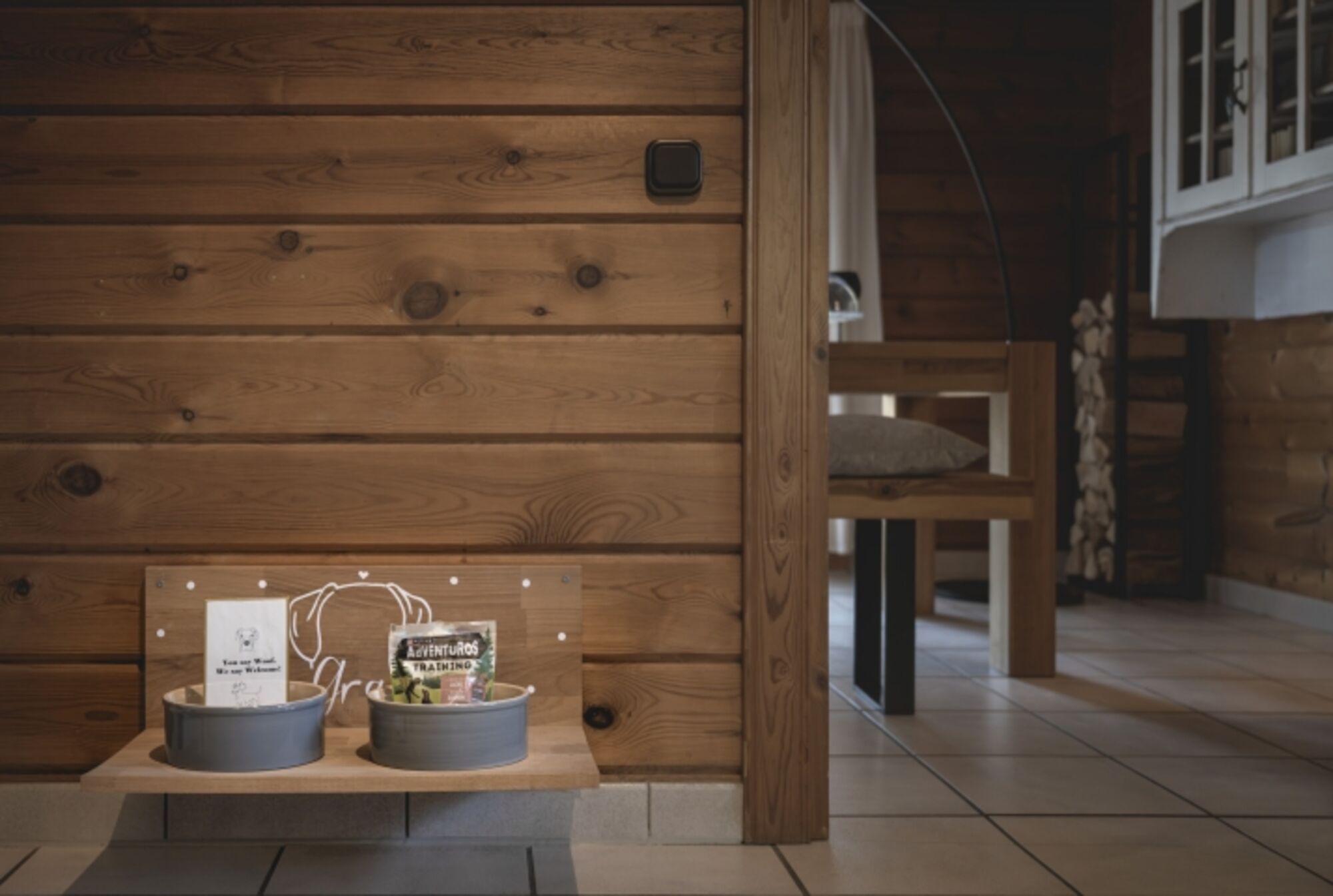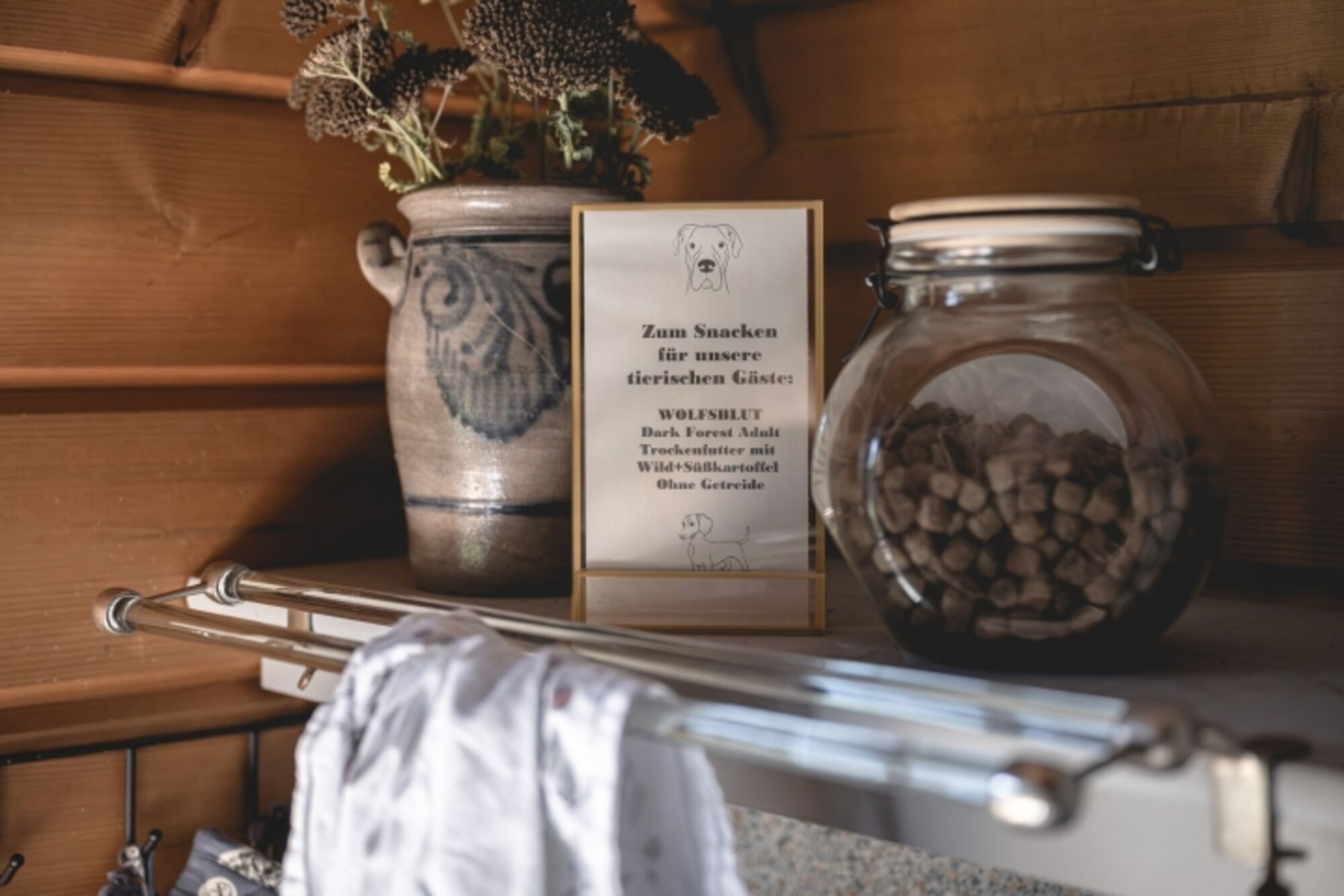 Hunde sind bei uns herzlich willkommen – mit kompletter Ausstattung: Fressnapf, Hundekorb, Decken, Kotbeutel, Leine und Bürste stehen für Ihren Aufenthalt bereit.