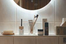 Waschbecken, Kosmetiktücher, Spiegel, Fenster im Bad, Bidet