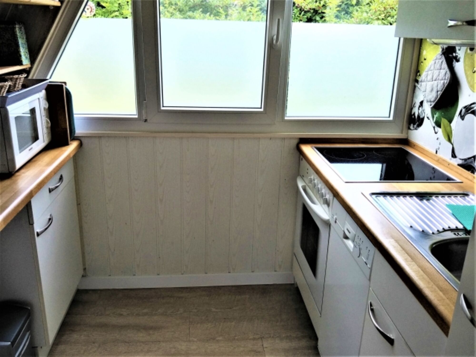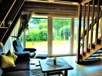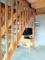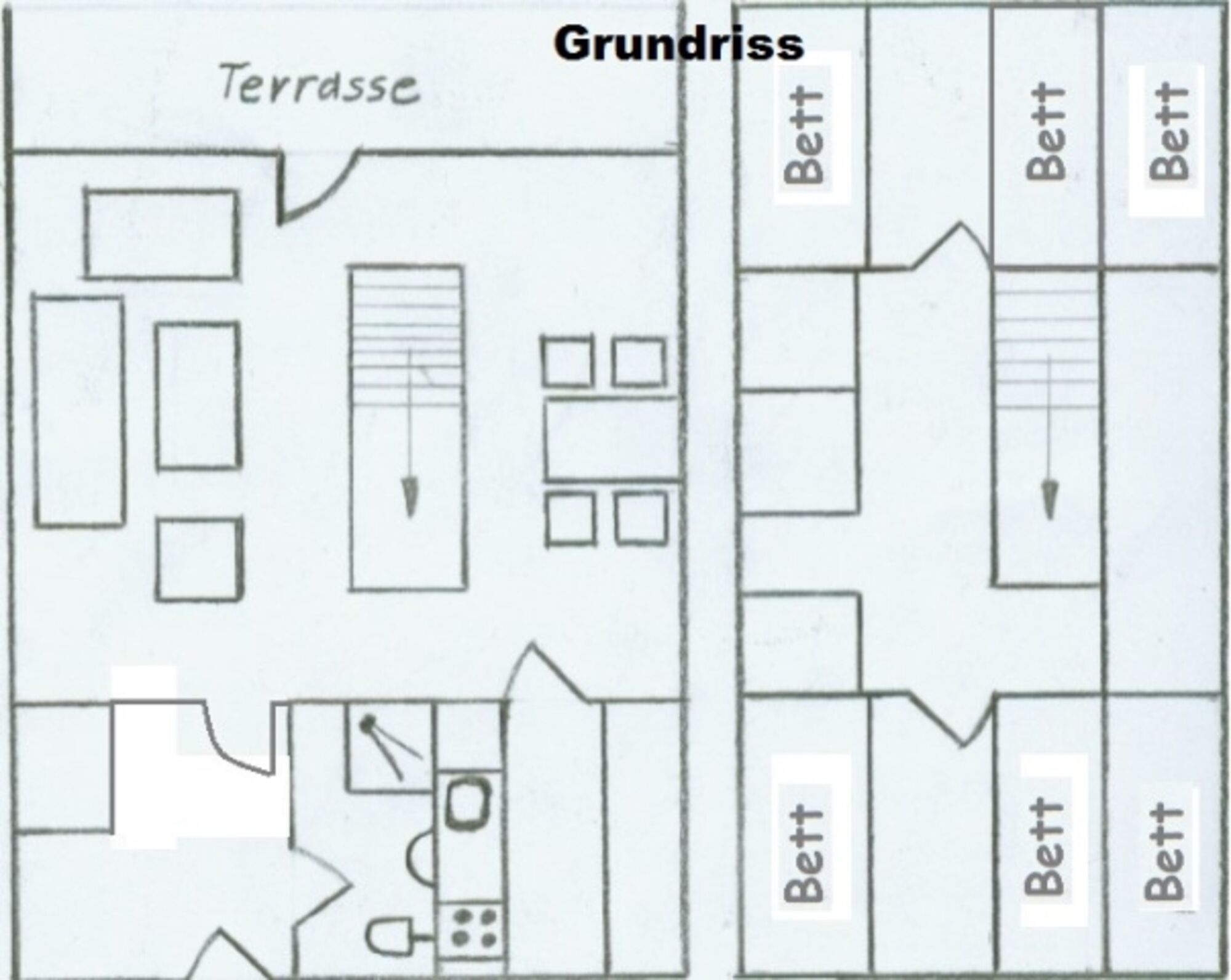 Im Erdgeschoß befinden sich Wohnzimmer mit Schlafcouch, Esszimmer, Küche (Kühlschrank mit Gefrierfach, Elektroherd mit Backofen und Ceranfeld, Geschirrspüler, Mikrowelle, Kaffeemaschine, Toaster, Wasserkocher, Mixer, Geschirr), Bad mit Dusche. Im Obergeschoß sind 2 Schlafräume mit je 3 Betten (je 1 Doppel- und 1 Einzelbett)