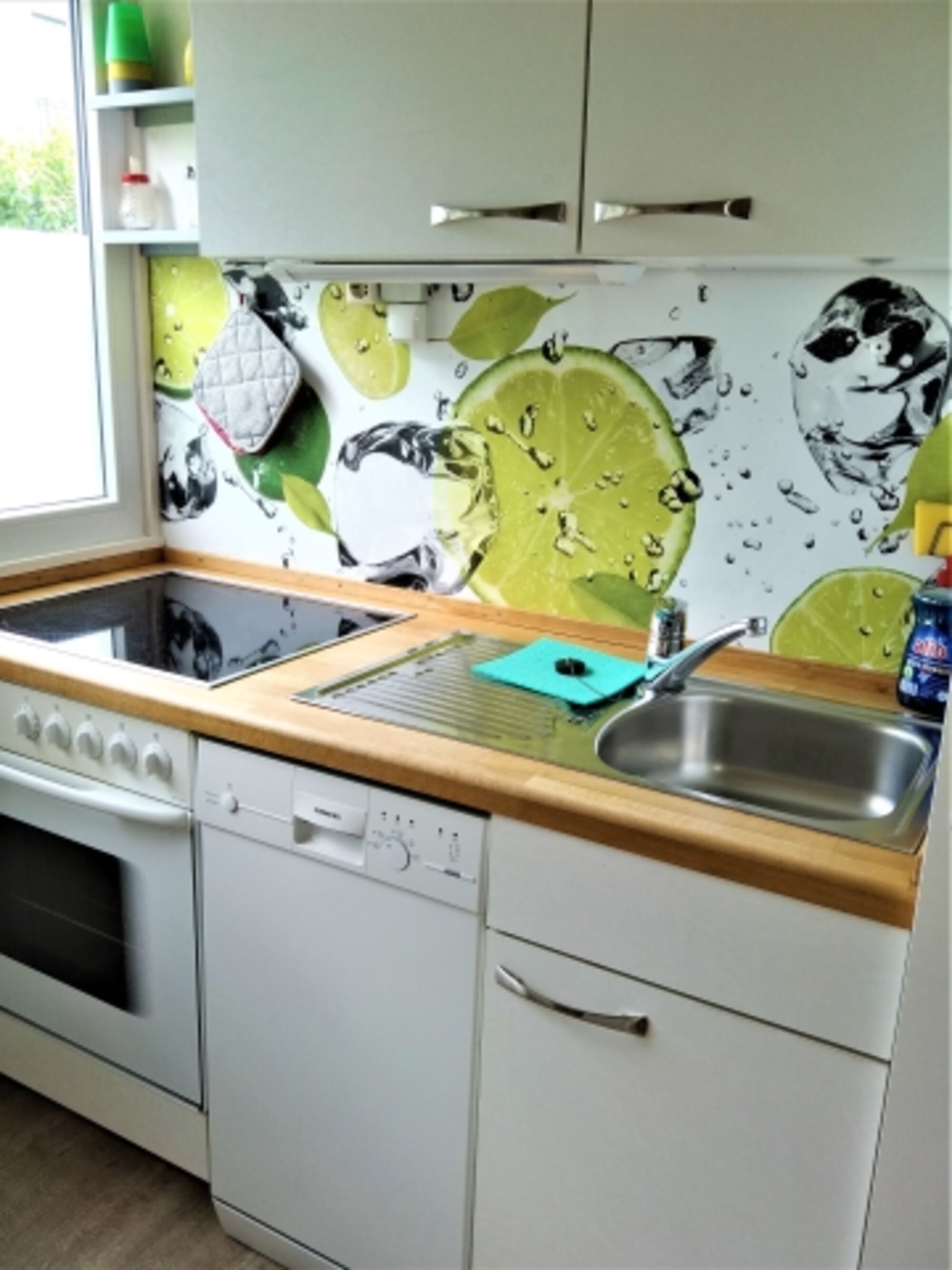 Cerankochfeld, Kühlschrank mit Gefrierfach, Mixer, Korkenzieher / Flaschenöffner, Gewürze (Salz, Pfeffer, Zucker), Mülltüten