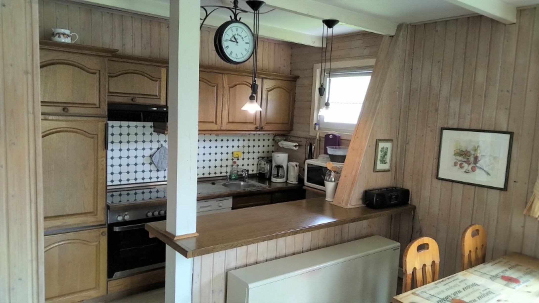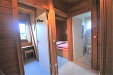 Das Blockhaus ist ebenerdig, bestehend aus Wohnzimmer mit Kamin und Schlafcouch, Essecke und Küche (Kühlschrank mit Gefrierfach, Elektroherd mit Backofen und Ceranfeld, Spülmaschine, Mikrowelle, Kaffeemaschine, Toaster, Wasserkocher, Mixer, Geschirr), im Elternschlafzimmer befinden sich 2 Einzelbetten bzw. durch Verschieben des linken Bettes ein Doppelbett (bitte mit U-Schienen die Betten verbinden) Kinderzimmer mit Etagenbetten, Bad mit Dusche.