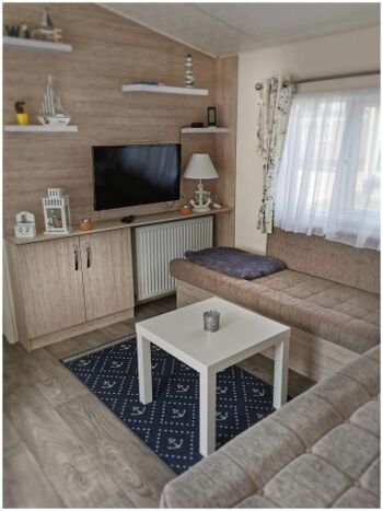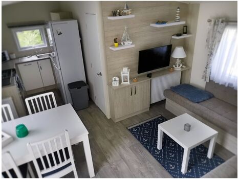 Der Wohnraum hat einen Esstisch, der bei Bedarf auch ausgezogen werden kann, sowie vier feste Essstühle und zwei weitere Klappstühle. Außerdem gibt einen TV mit Amazon-FireTV Stick sowie eine Alexa zum Musik hören.