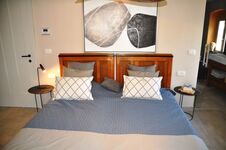 angrenzendes Bad mit Wanne Doppelbett 1,60 x 2,00m, Kommode, Leselampe am Bett