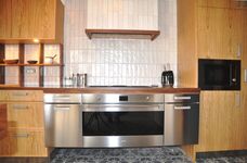 Cerankochfeld, Dunstabzugshaube, Kühlschrank mit Gefrierfach, Geschirrhandtücher, Essplatz in der Küche