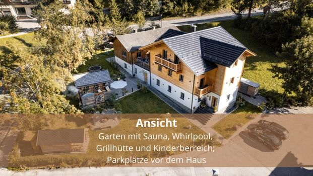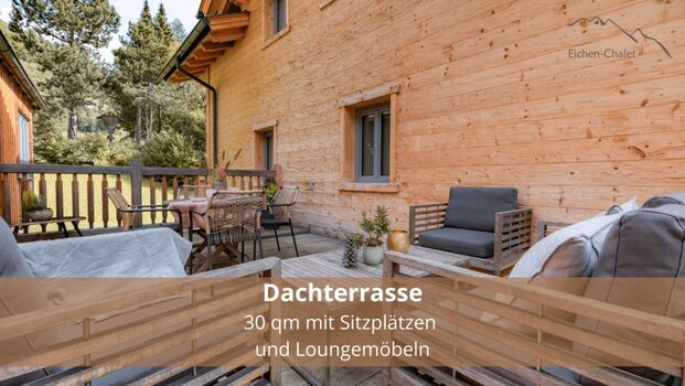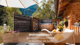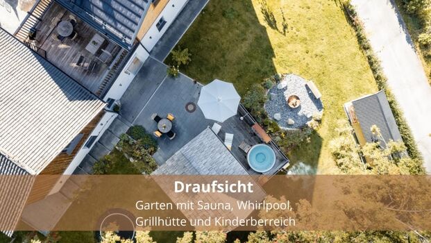 Die Wohnung verfügt über eine 30qm Dachterrasse mit privatem Whirlpool und einem Balkon. Diese stehen exklusiv zur Verfügung. Der Garten darf von allen Gästen genutzt werden und verfügt über eine Feuerstelle, Spielplatz, Sauna und Whirlpool sowie diverse Terrassen und Sitzmöglichkeiten.