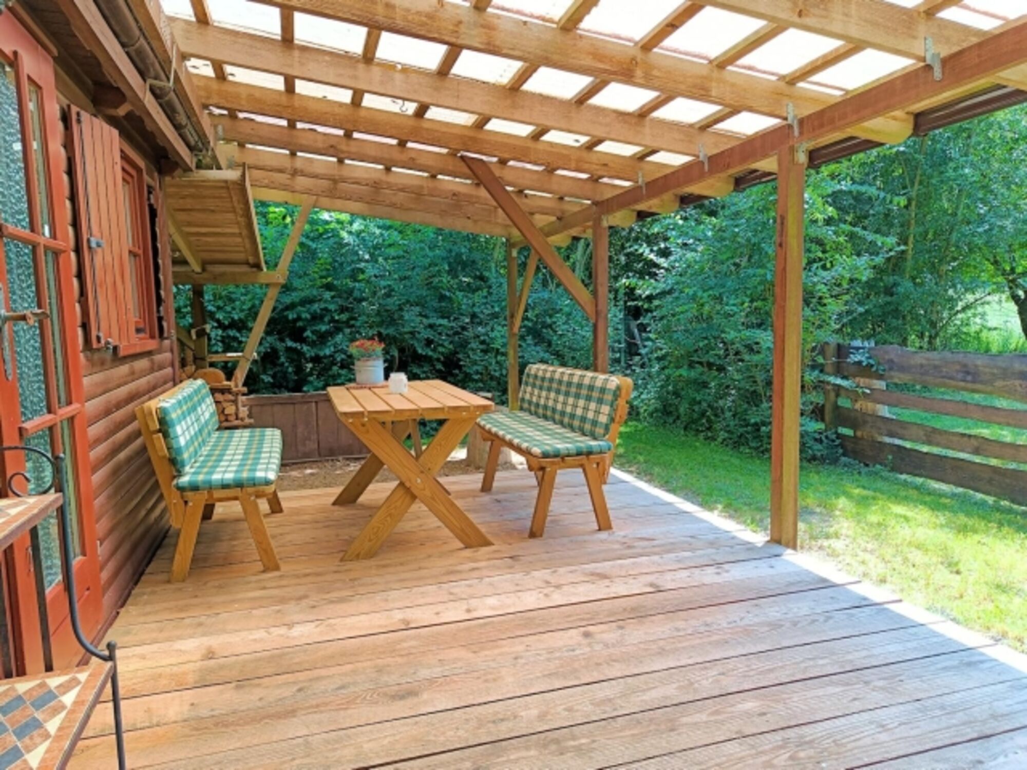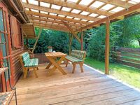 Unser Holzhäuschen verfügt über insgesamt 3 Zimmer, eine schöne große Terrasse und der Garten ist zu allen Seiten eingezäunt, sodass Sie Ihren Hund - sofern er kein Ausbruchskünstler ist - ohne Sorge laufen lassen können. In unserem Häuschen können bis zu 2 Personen übernachten. Dafür gibt es ein separates Schlafzimmer mit Doppelbett. Im 2023 frisch renovierten Wohn- / Esszimmer finden Sie ein 2-Sitzer-Sofa, einen Flachbildschirm mit Sat-TV, DAB+ Radio mit Bluetooth sowie eine Essecke. Die separate Küche ist ausgestattet mit Kühlschrank, Toaster, Kaffeemaschine, Eierkocher, Wasserkocher, 2-Platten-Induktionsceranfeld, Minibackofen. Kochtöpfe, Geschirr und Besteck sind natürlich auch vorhanden. Das Bad ist mit Dusche/WC ausgestattet.