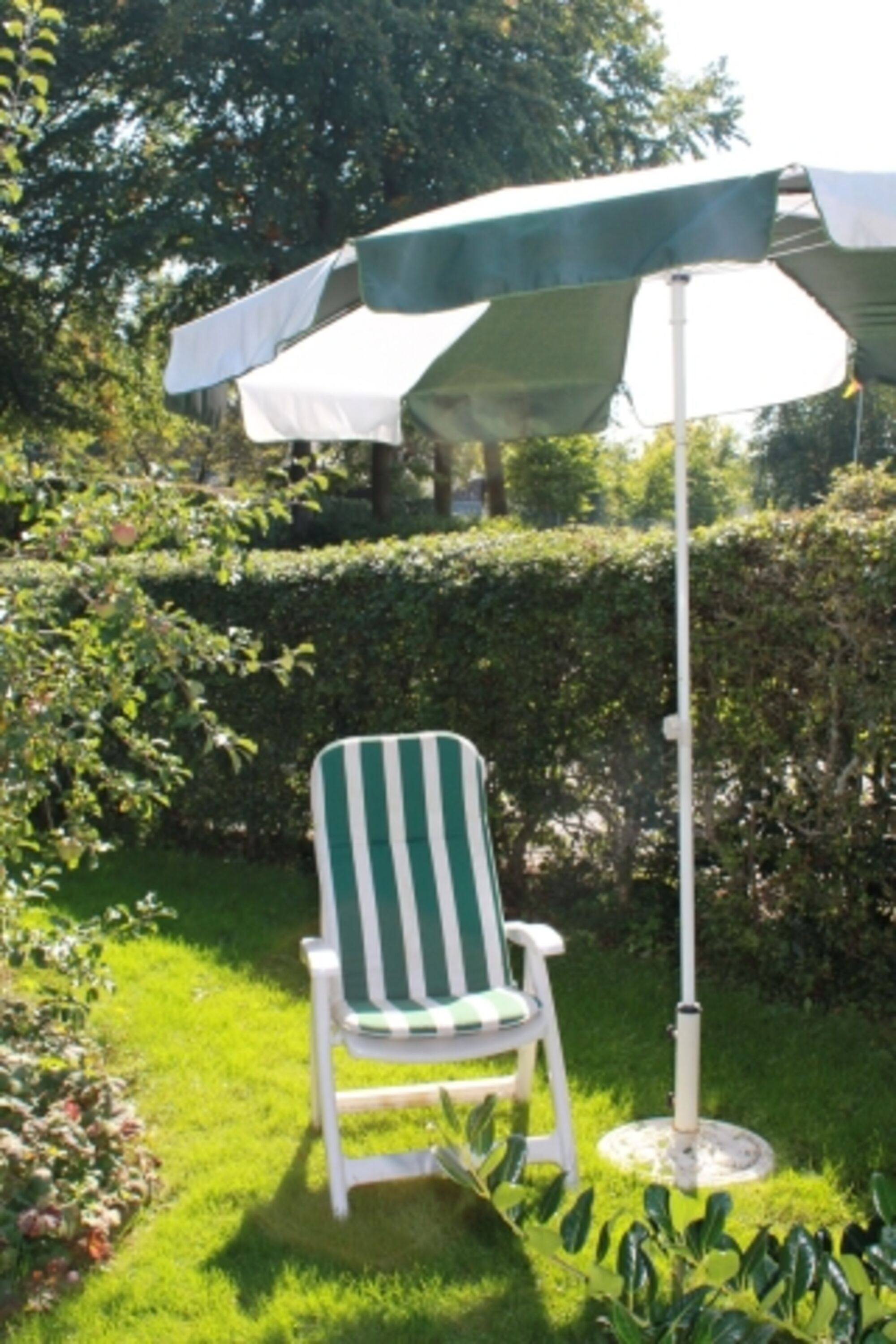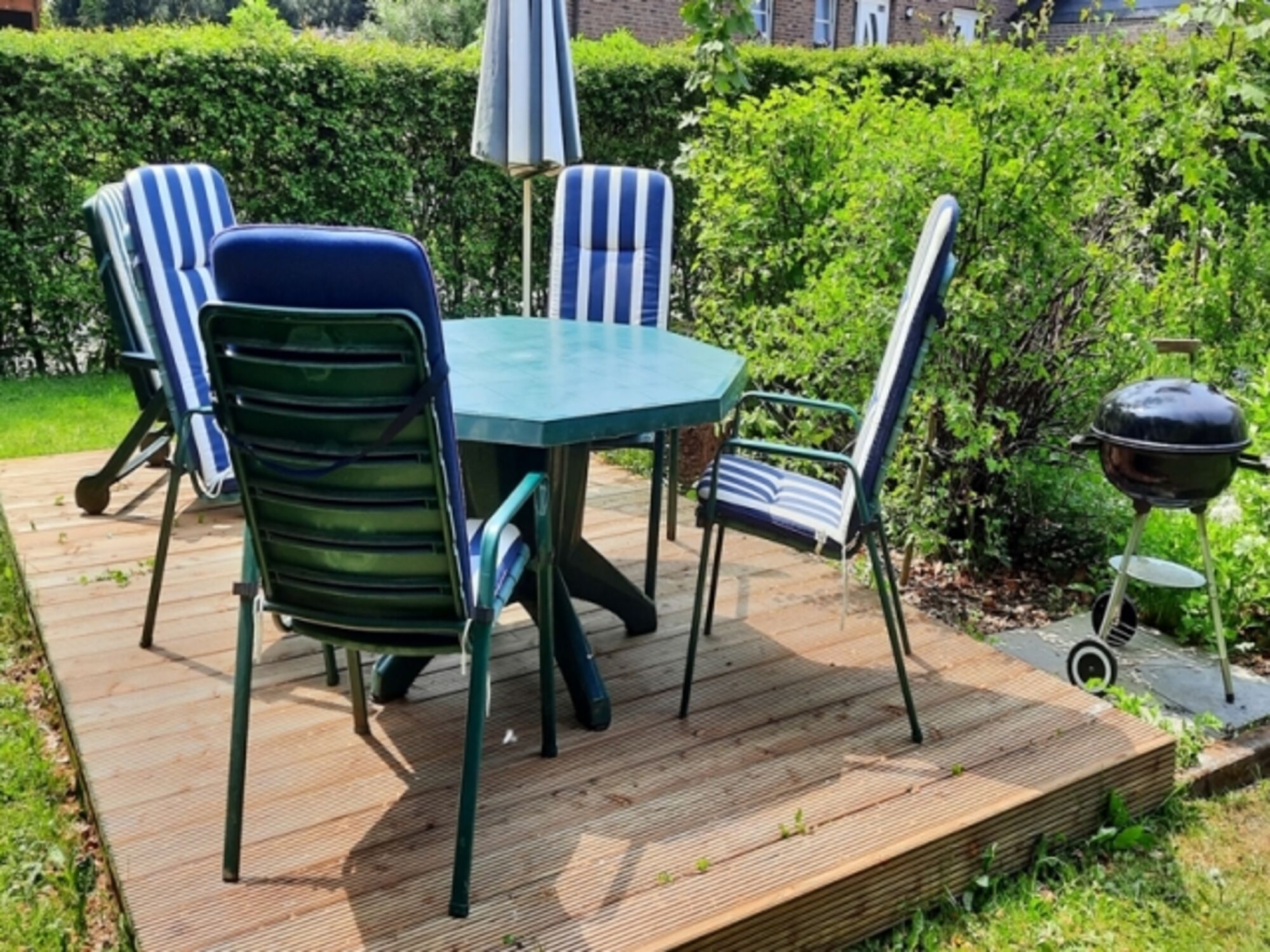 Kleiner Garten mit Gartenmöbeln und Sonnenschirm