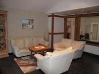 Im gemütlichen Wohnzimmer befinden sich zwei Sofas, ein Sessel und ein Flachbild-Fernseher. Das angrenzende Esszimmer verfügt über einen großzügigen Tisch mit 8 Stühlen.
