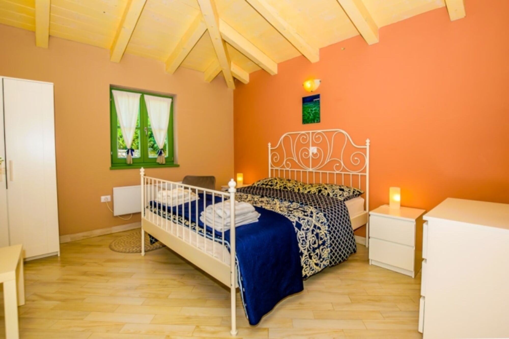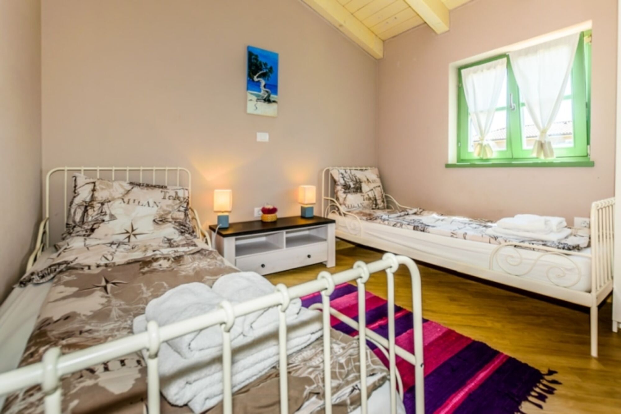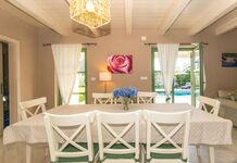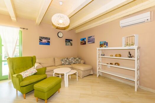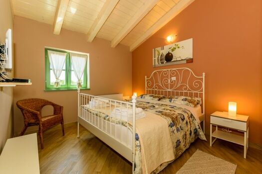 Die Villa verteilt sich auf zwei Etagen und besteht aus 4 Schlafzimmern (drei Schlafzimmer mit Doppelbett, ein Zweibettzimmer) mit 3 Badezimmern und einem schönen Wohnzimmer mit angeschlossener Küche und Essbereich. Die Außenanlage rund um den Swimmingpool erstreckt sich über eine gepflegte Rasenfläche von 980 m² mit 4 Liegestühlen und 2 Sonnenschirmen aus Naturmaterialien. Der Wellnessbereich, der sich in einem separaten kleinen Gebäude befindet, wird Ihren entspannenden Urlaub mit einer finnischen Sauna, einer Entspannungszone und einem zusätzlichen Badezimmer ergänzen. Die Villa Igo ist mit digitalem Satelliten-TV und WLAN ausgestattet.