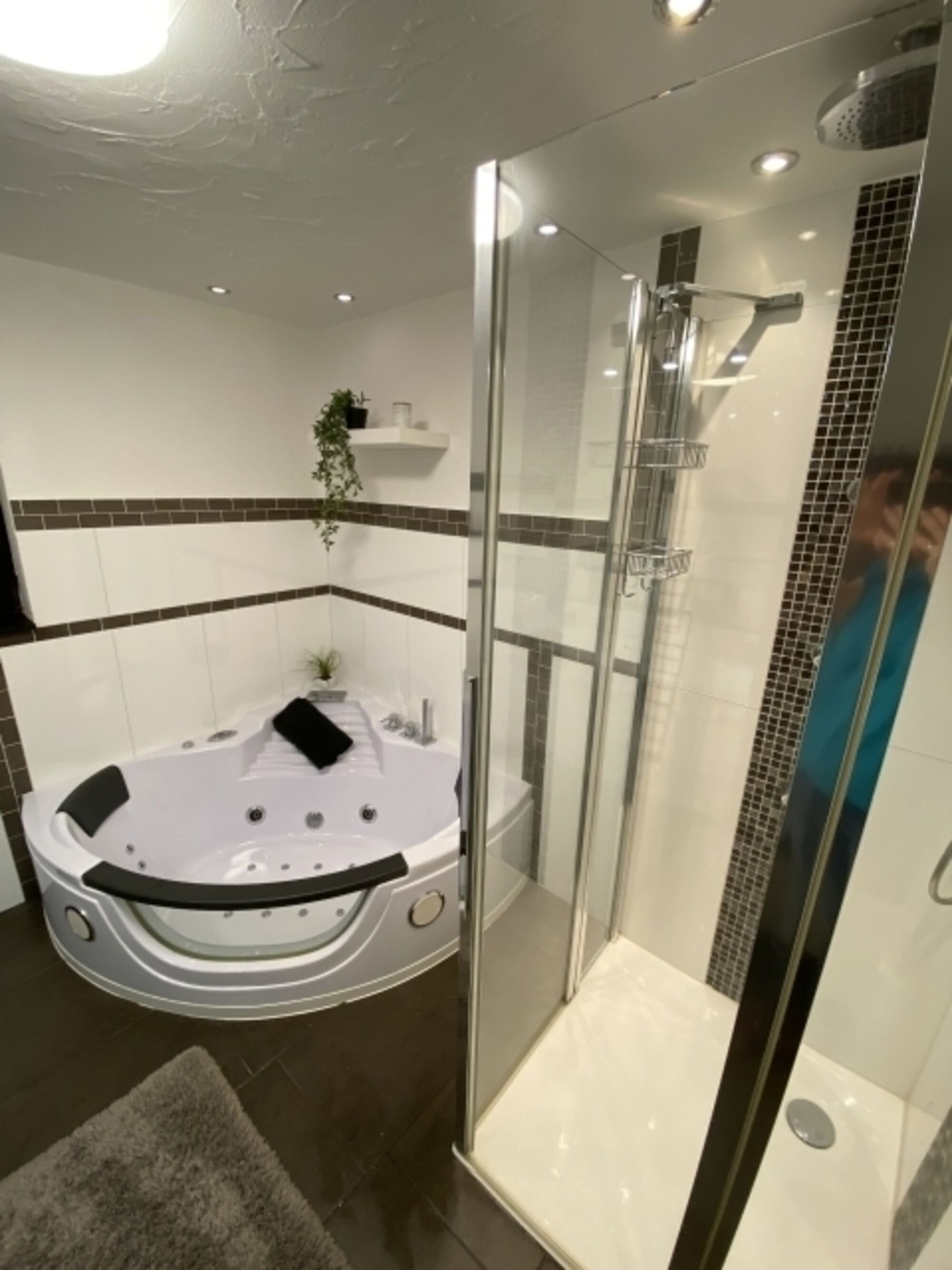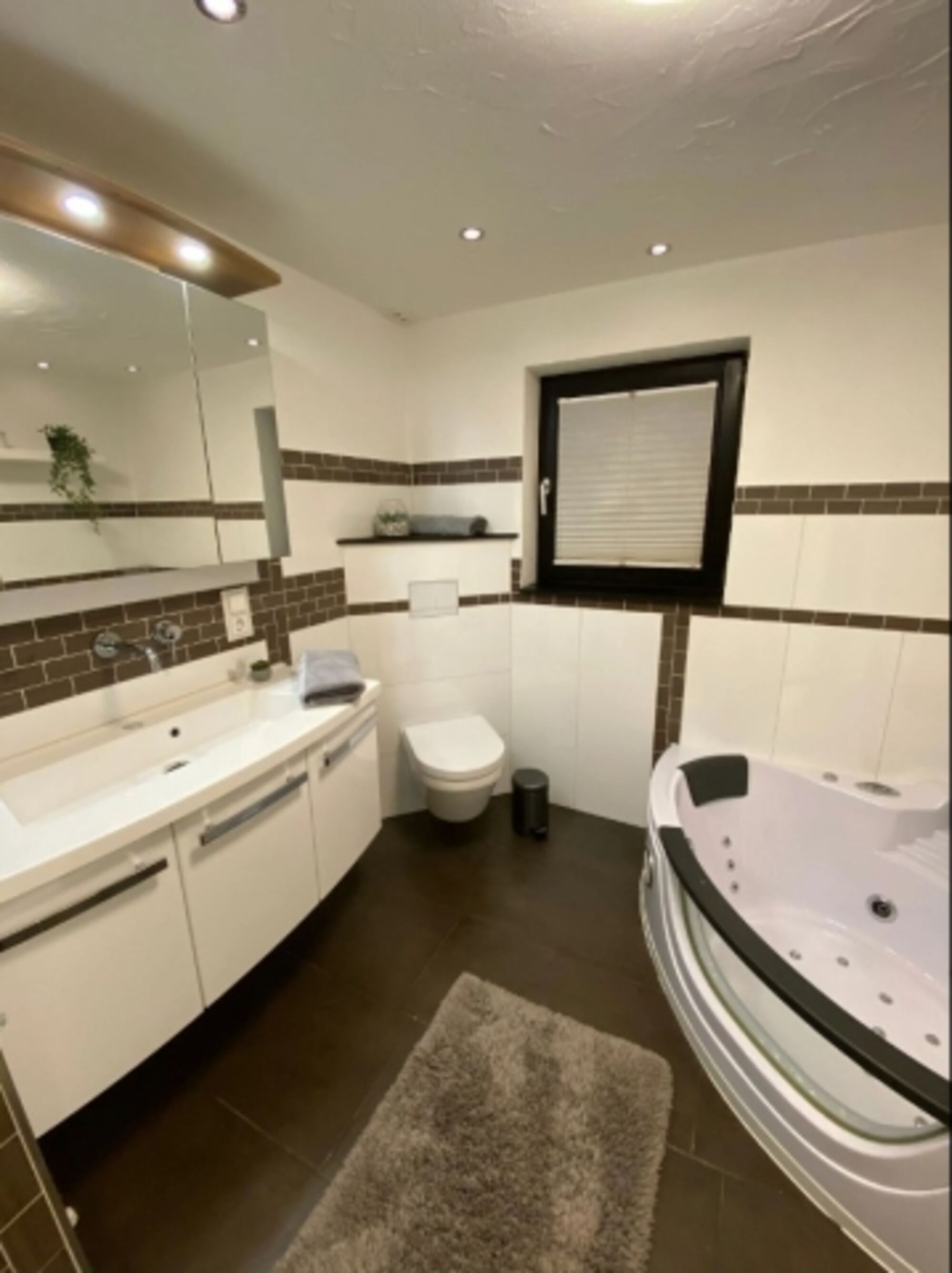 Badewanne mit Whirlpool, Waschbecken, Regendusche, Spiegel, Fenster im Bad