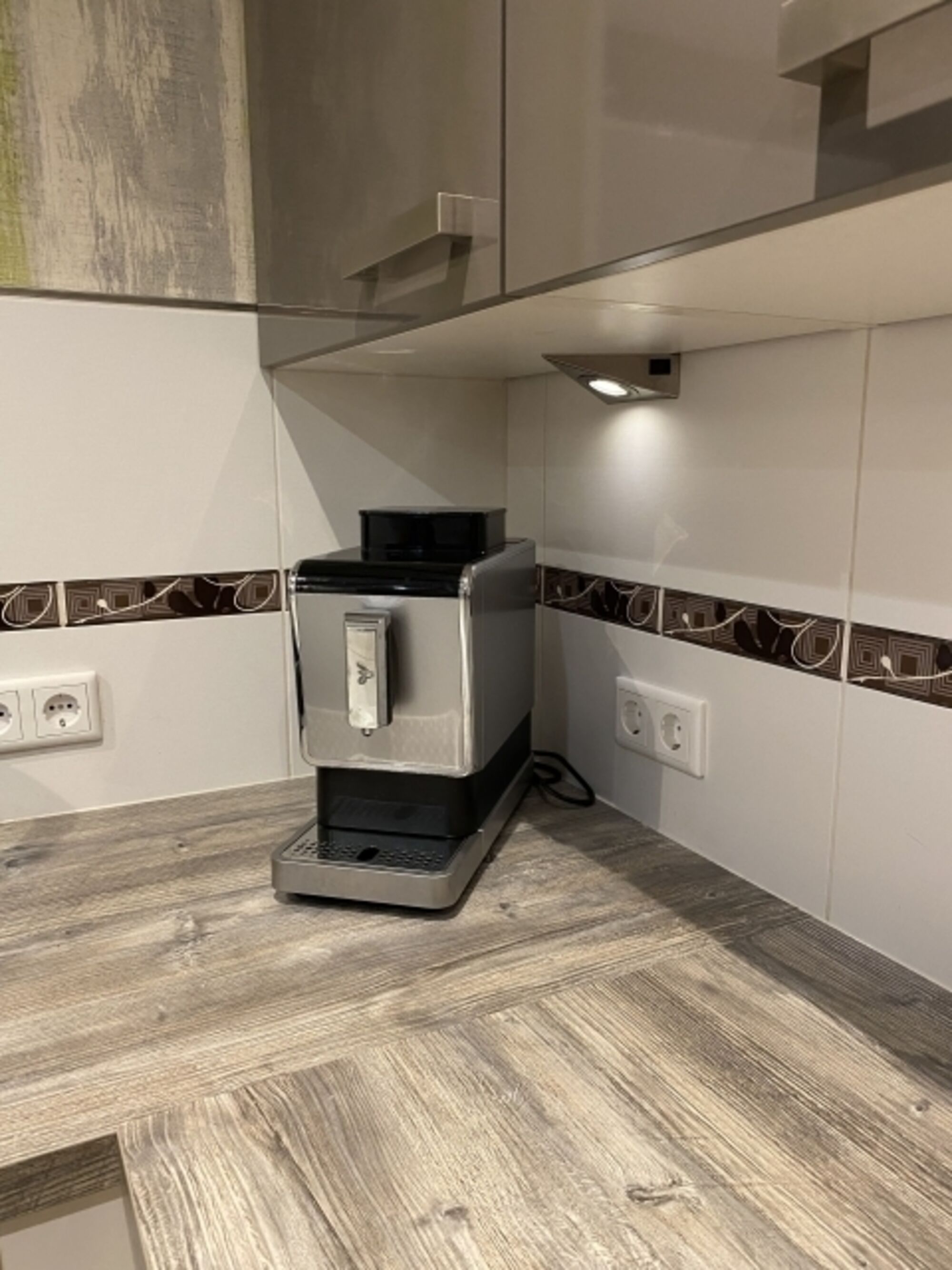 Induktionsherd, Dunstabzugshaube, Kühlschrank mit Gefrierfach, Kaffeevollautomat, Senseo-Kaffeeautomat, Eierkocher, Korkenzieher / Flaschenöffner, Gewürze (Salz, Pfeffer, Zucker), Geschirrhandtücher, Mülltüten
