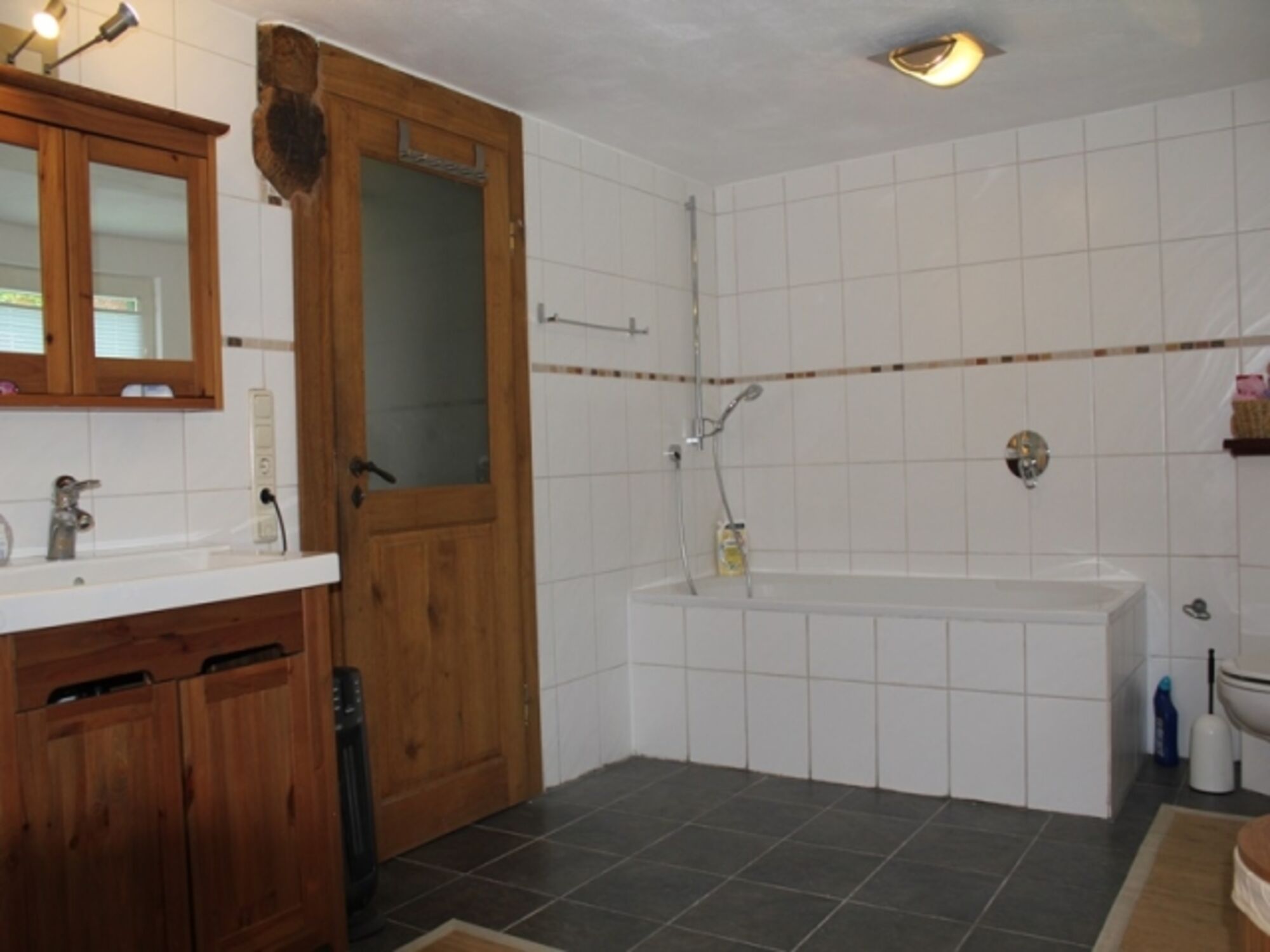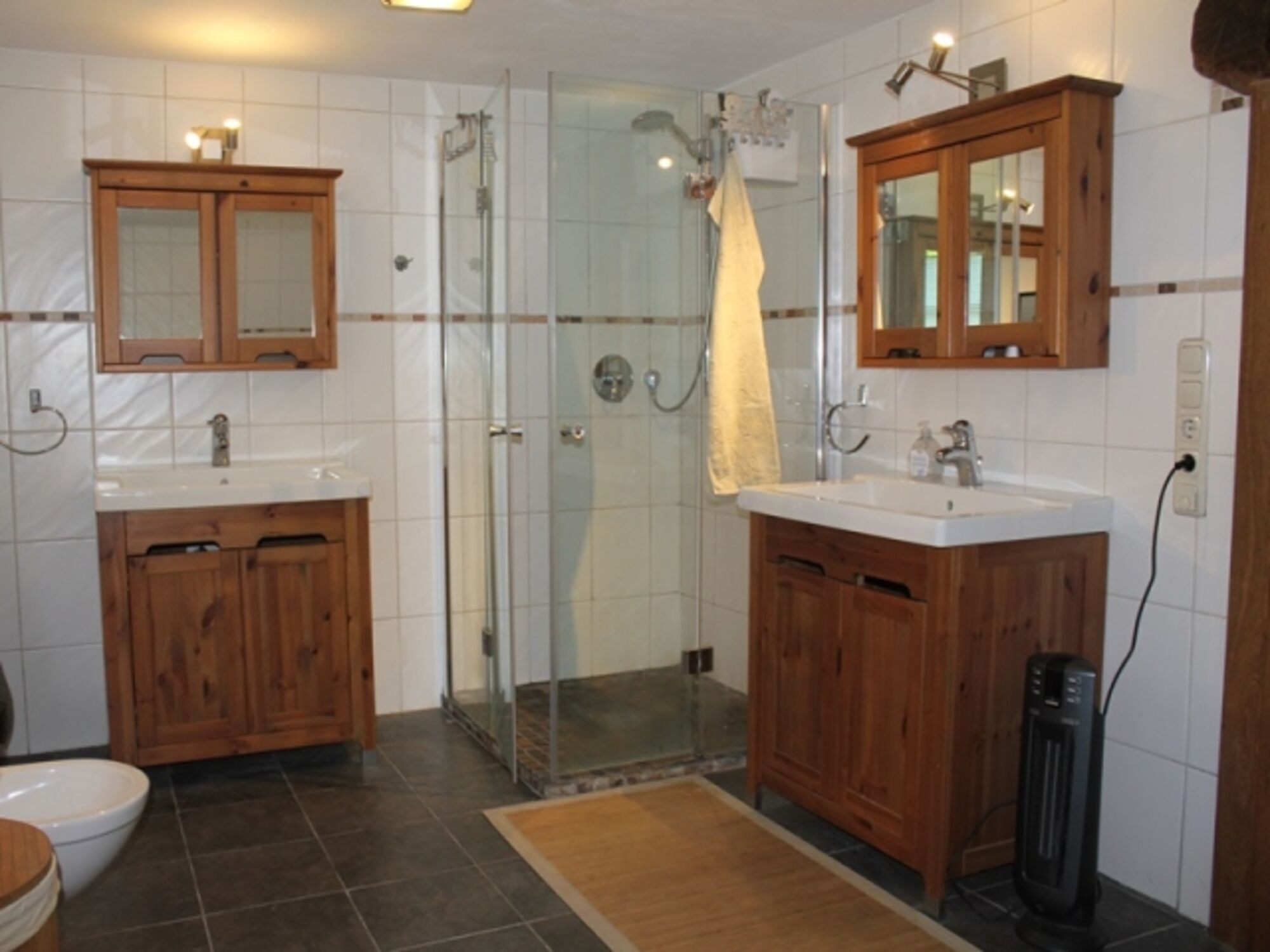 Im modernen Bad befinden sich zwei Waschtische, eine ebenerdige Dusche, eine Badewanne, ein Urinal und Bidet sowie ein WC.