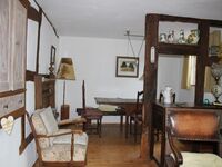 Das urige Wohn-/Esszimmer verfügt über einen großen Tisch mit 6 Stühlen, einem Holz-Ofen für gemütliche Abende und über ein TV-Gerät.