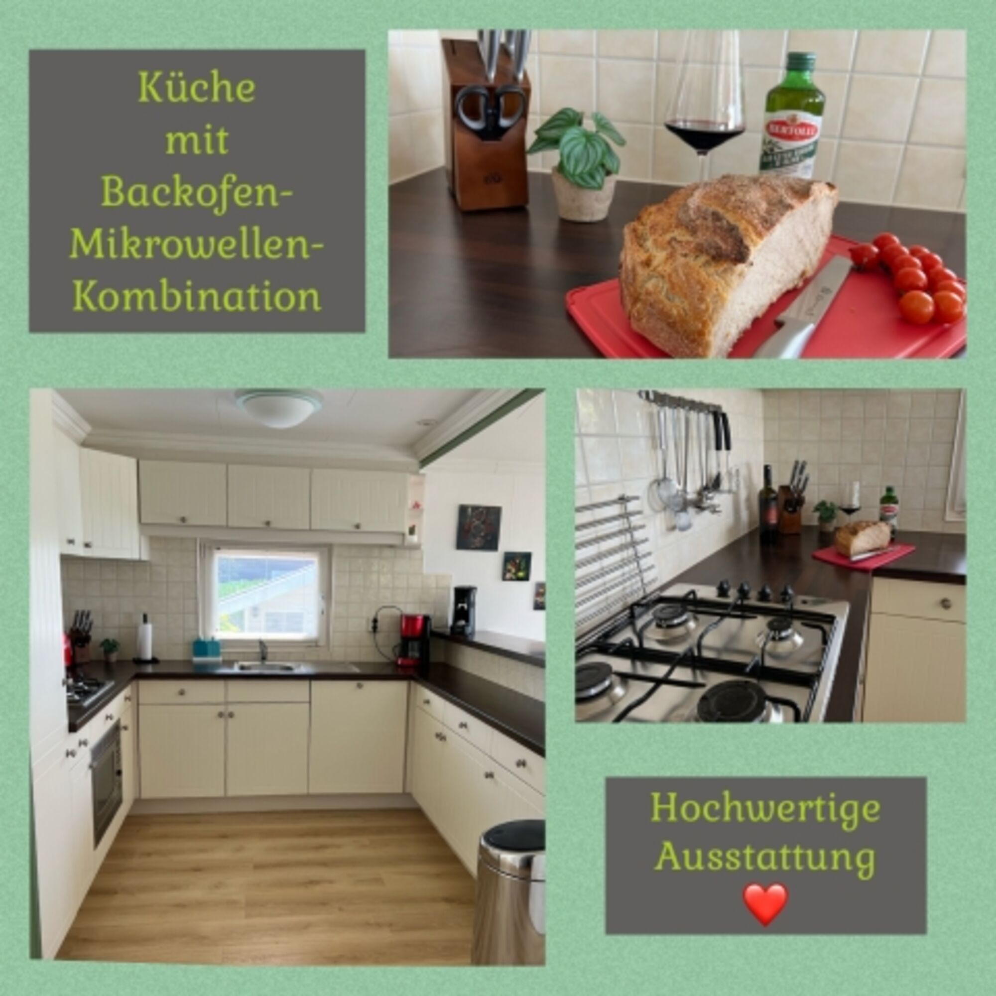 4-Platten Herd, Gasofen / Gasherd, Dunstabzugshaube, Kühlschrank mit Gefrierfach, Senseo-Kaffeeautomat, Mixer, Elekt. Fruchtpresse, Korkenzieher / Flaschenöffner, Gewürze (Salz, Pfeffer, Zucker), Öl / Essig, Mülltüten, Essplatz in der Küche