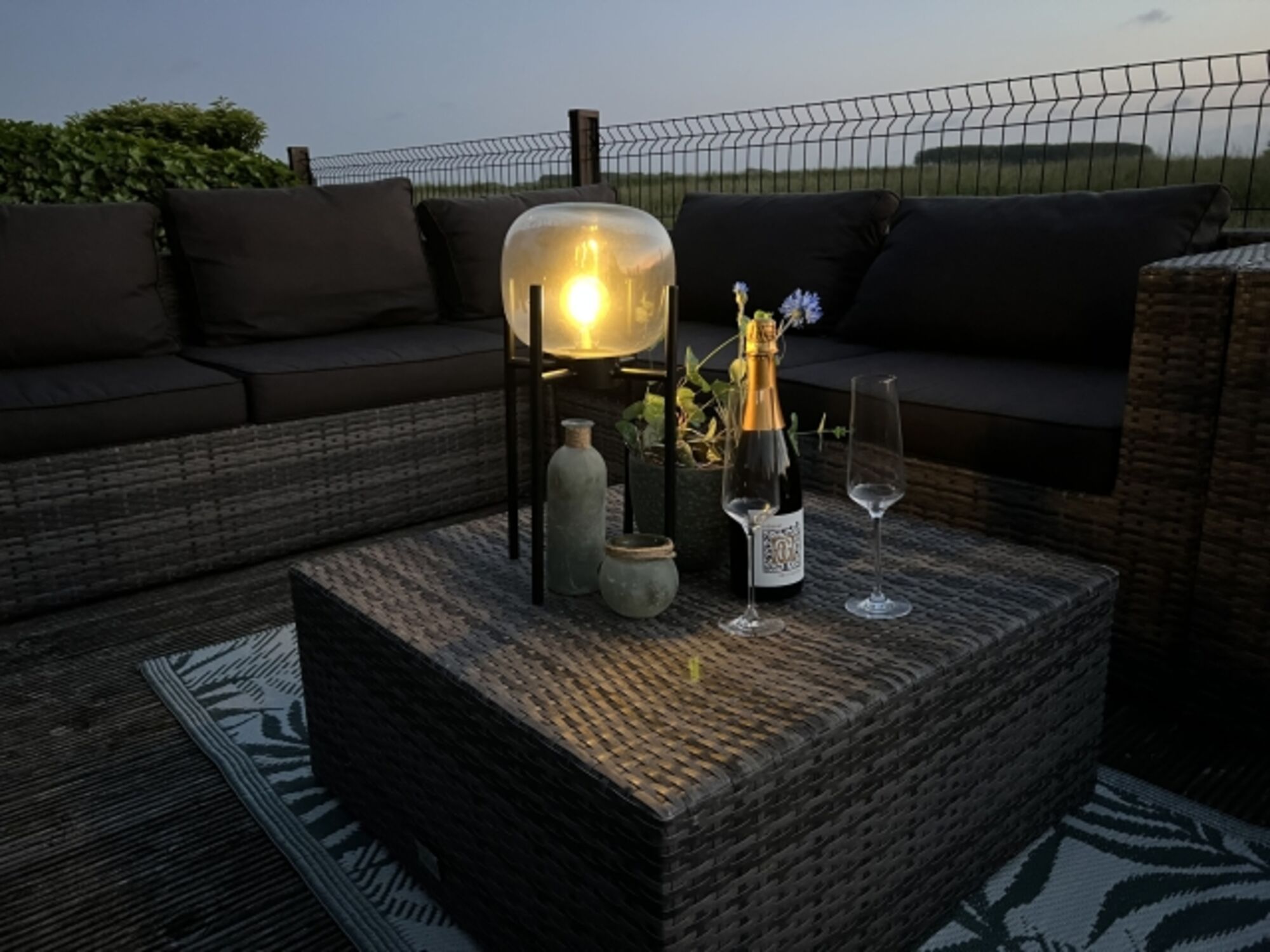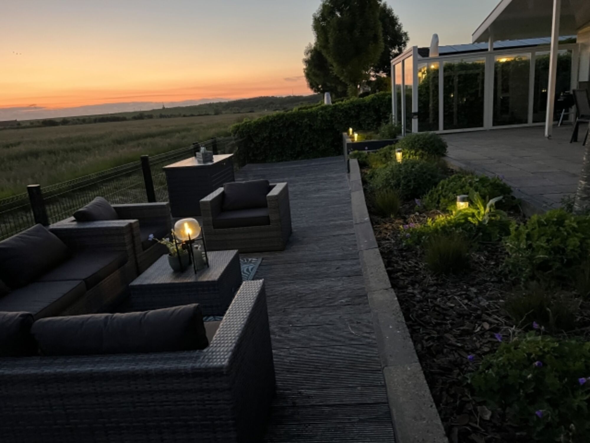 Der Außenbereich, verbunden mit der traumhaften Aussicht auf die Waterdunen und auf den Leuchtturm am Strand, bietet Entspannung pur. Windgeschützt kann man auf der überdachten Terrasse mit bis zu 8 Personen entspannt Essen und Trinken. Eine kleine Holz-Sitzgruppe bietet eine weitere Möglichkeit bei einem gemütlichen Miteinander den Sonnenuntergang zu beobachten. Der Holzsteg vor den Terrassen ist einmalig in diesem Park. Eine Lounge-Ecke und zwei Liegen runden das perfekte Urlaubsfeeling ab.