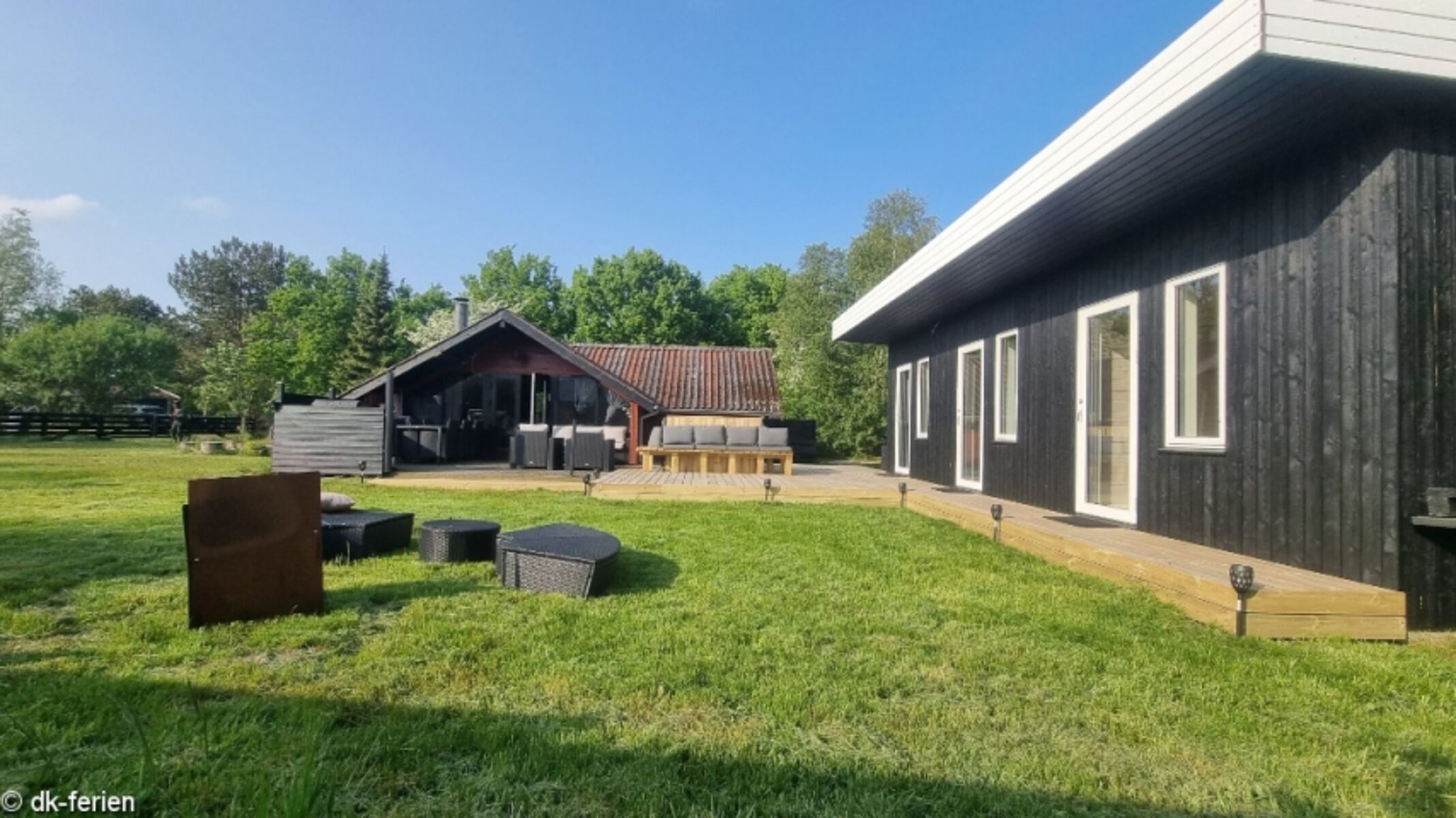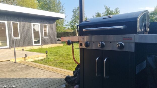 Auf dem Grundstück des Ferienobjekts selbst finden deine pelzigen Freunde ausreichend Platz zum Toben. Der eingezäunte Grund bietet ihnen die Freiheit, unbeschwert die Umgebung zu erkunden. Währenddessen können sich die erwachsenen Gäste auf den teilweise überdachten Terrassen entspannen, grillen und die Sonne genießen. Eine der Terrassen verfügt sogar über eine ausziehbare Seitenmarkise, um ungestört zu sitzen. An der Feuerstelle mit acht Holzstamm-Hockern kannst du außerdem wundervolle Stunden verbringen.