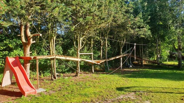 Für das ultimative Wellnesserlebnis im Freien steht ein wohltuender Außen-Whirlpool für fünf Personen gratis zur Verfügung . Dieser sorgt für pure Entspannung und lässt dich den Alltagsstress vergessen. Das Grundstück bietet außerdem tolle Möglichkeiten für Spaß und Vergnügen, sowohl für die großen als auch die kleinen Urlauber. Im hinteren Bereich des Gartens gibt es eine Schwebebahn und Gehbrücken zwischen den Bäumen in verschiedenen Schwierigkeitsgraden. Langeweile ist hier ausgeschlossen!