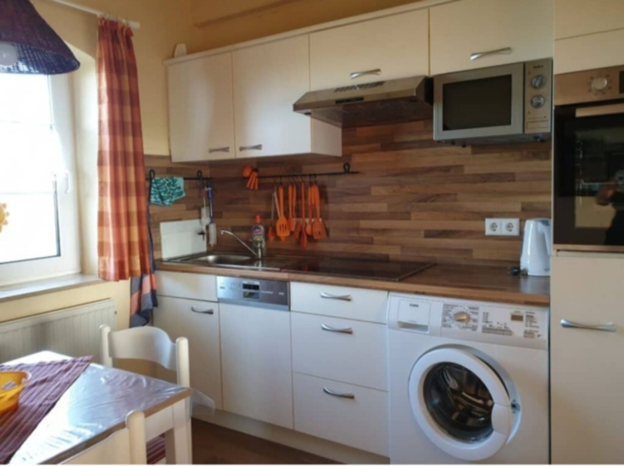 4-Platten Herd, Cerankochfeld, Dunstabzugshaube, Kühlschrank mit Gefrierfach, Mixer, Korkenzieher / Flaschenöffner, Geschirrhandtücher, Mülltüten, Essplatz in der Küche