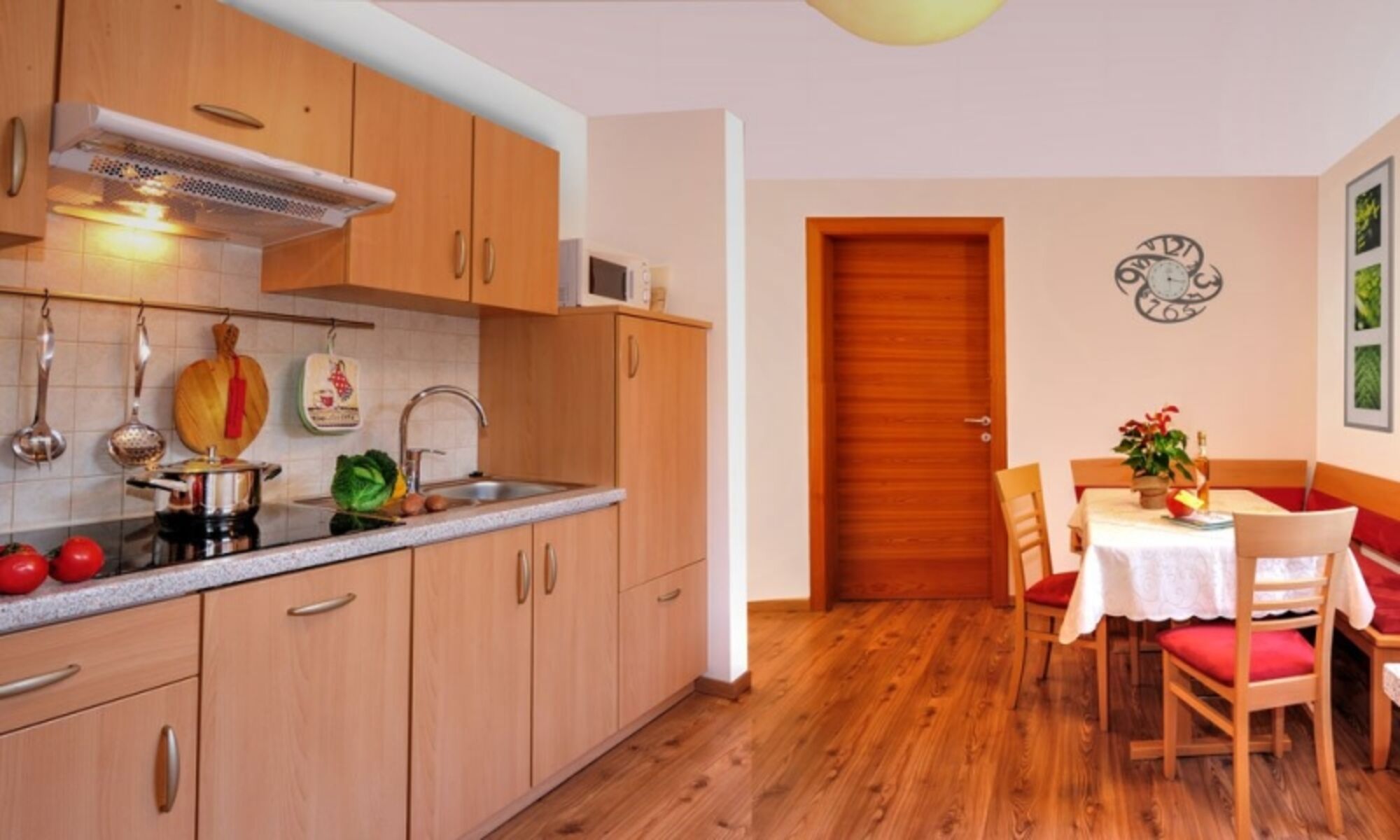 4-Platten Herd, Cerankochfeld, Dunstabzugshaube, Kühlschrank mit Gefrierfach, Mixer, Korkenzieher / Flaschenöffner, Geschirrhandtücher, Essplatz in der Küche