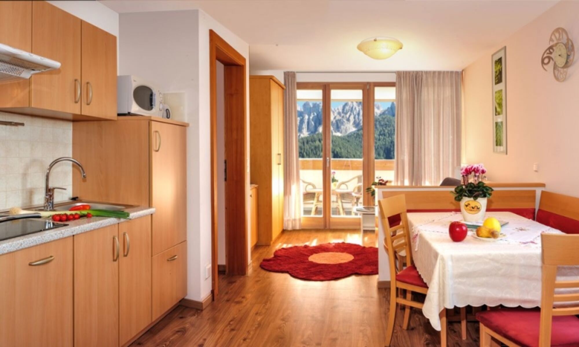 Gemütlicher Esstisch mit Bank und komplett eingerichtete Kochecke