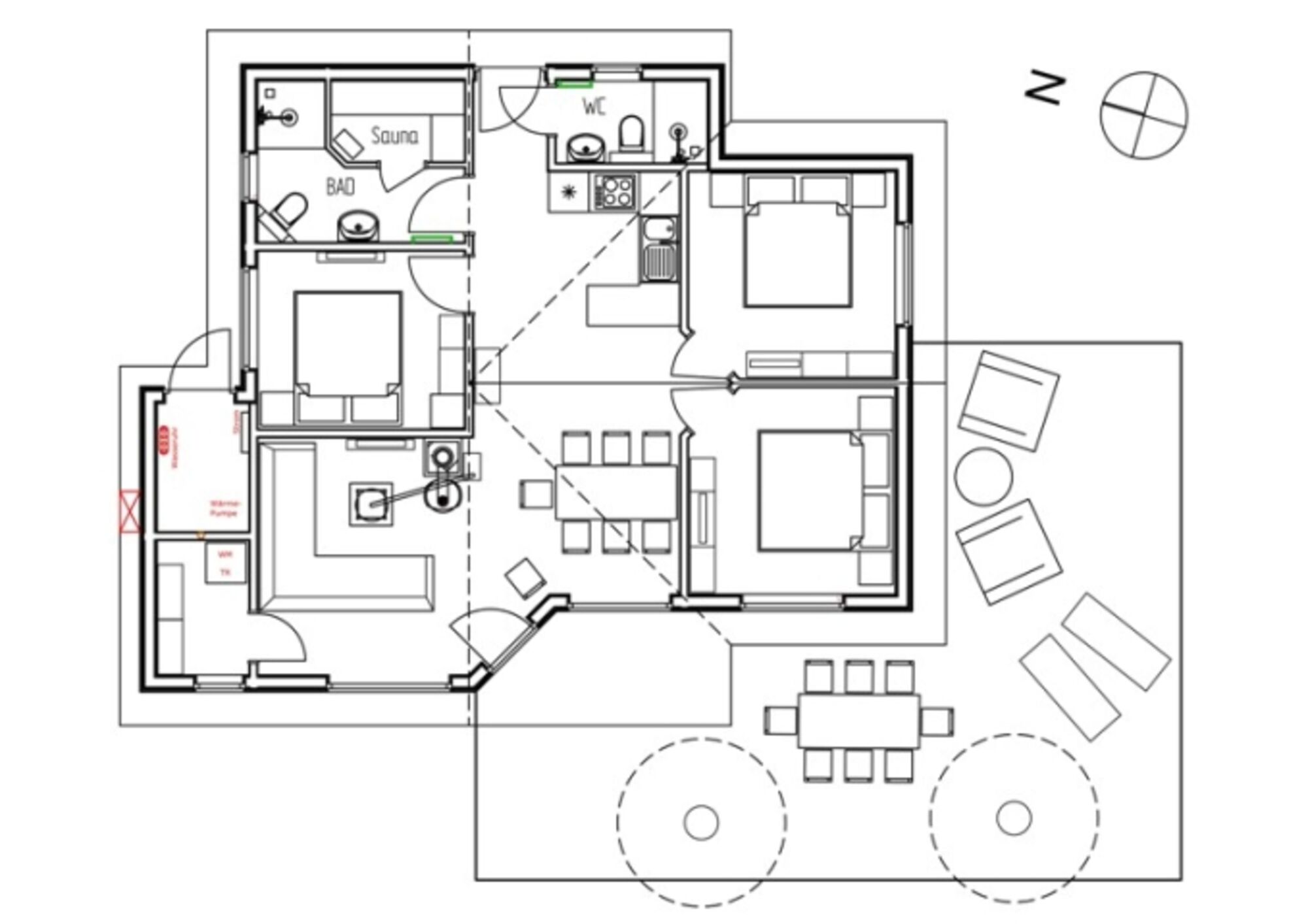Außenausstattung: Terrasse, Gartenmöbel, Liegen, Sonnenschirm, Strandkorb am Haus, Grill, Bollerwagen, 2 PKW-Stellplätze, viel Rasen